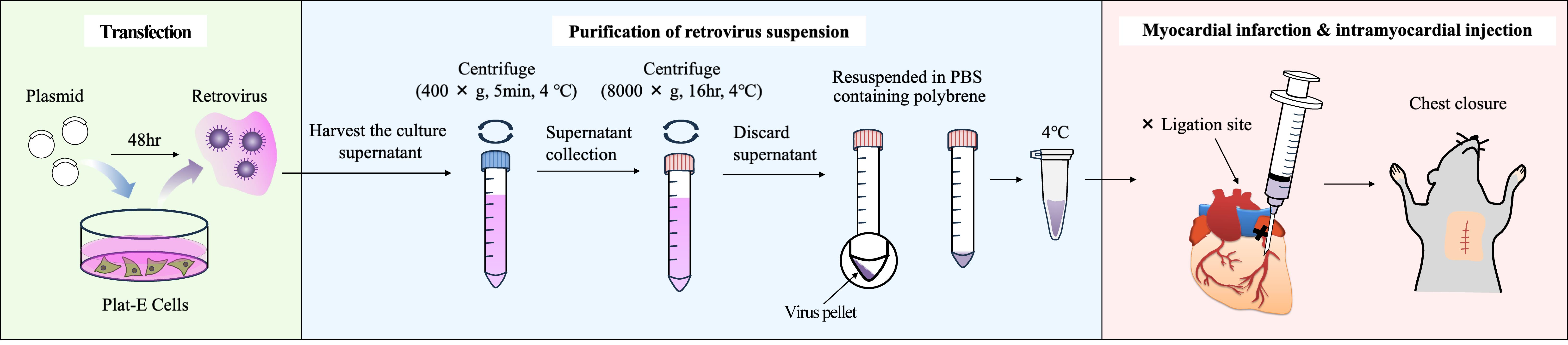 3. To prepare the retrovirus suspension, viruses should be collected and centrifuged one day before myocardial infarction and intramyocardial injection.