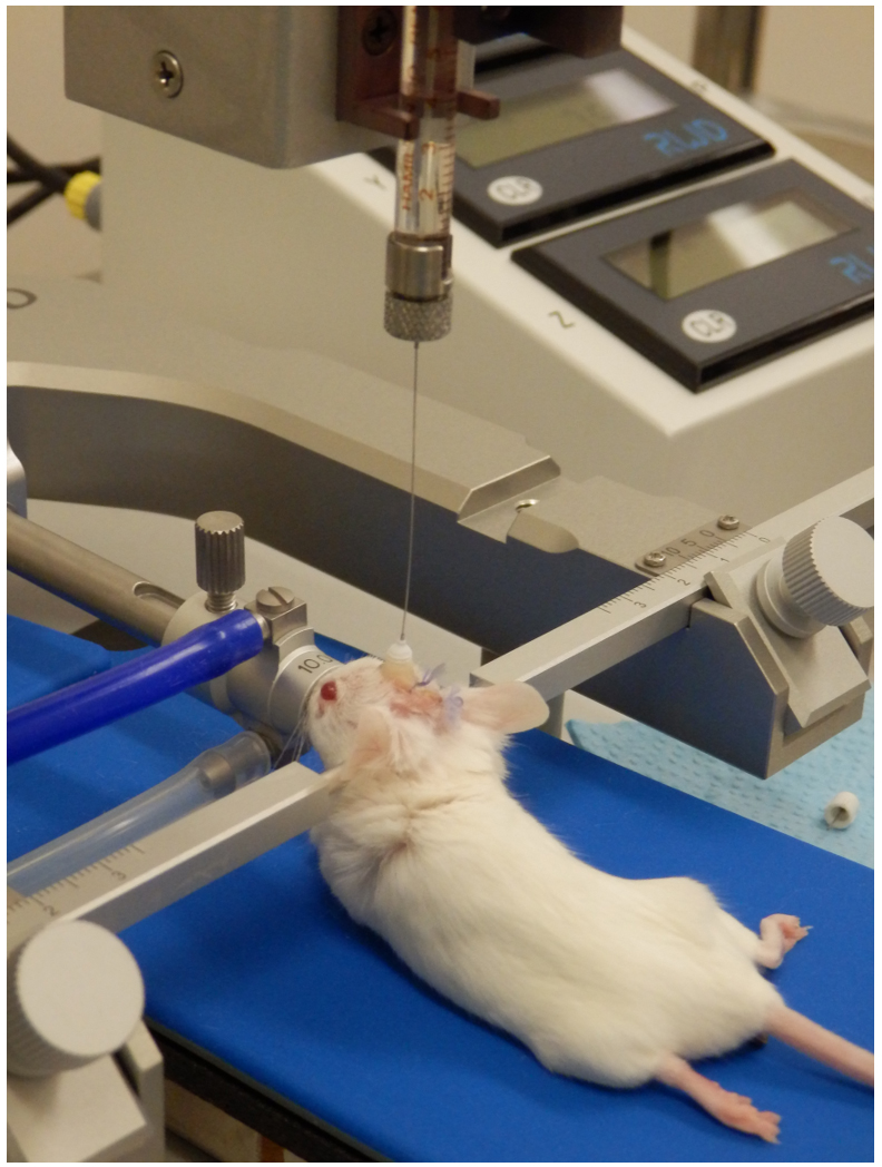 5. Load a volume of 2 μL, corresponding to 50,000 cells, into a 10 μL Hamilton syringe mounted on the arm of the stereotaxic frame.