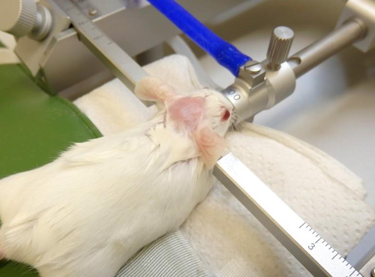 3. Secure the animal in a stereotaxic frame using a buccal bar (positioned to hold the incisors) and bilateral ear bars inserted into the ear canals. A metal tube connected to the anesthesia inlet helps stabilize the head further.