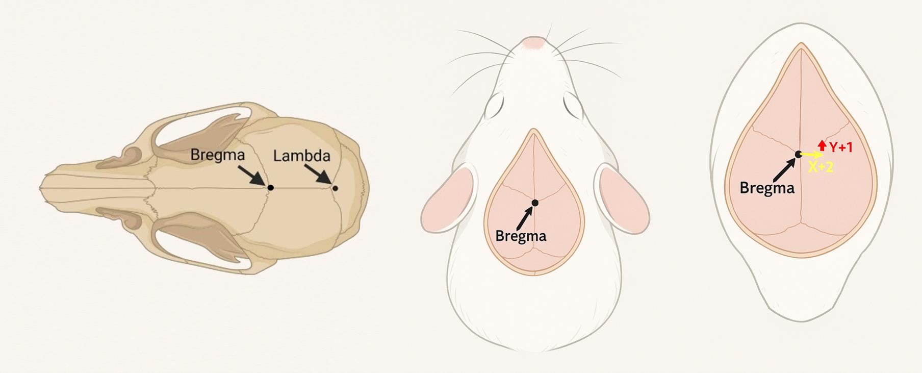 3. From this reference, advance the needle based on the stereotaxic coordinates as described by Paxinos and Keith [6], moving 2 mm laterally to the right (X + 2) and 1 mm anteriorly (Y + 1) relative to the bregma.