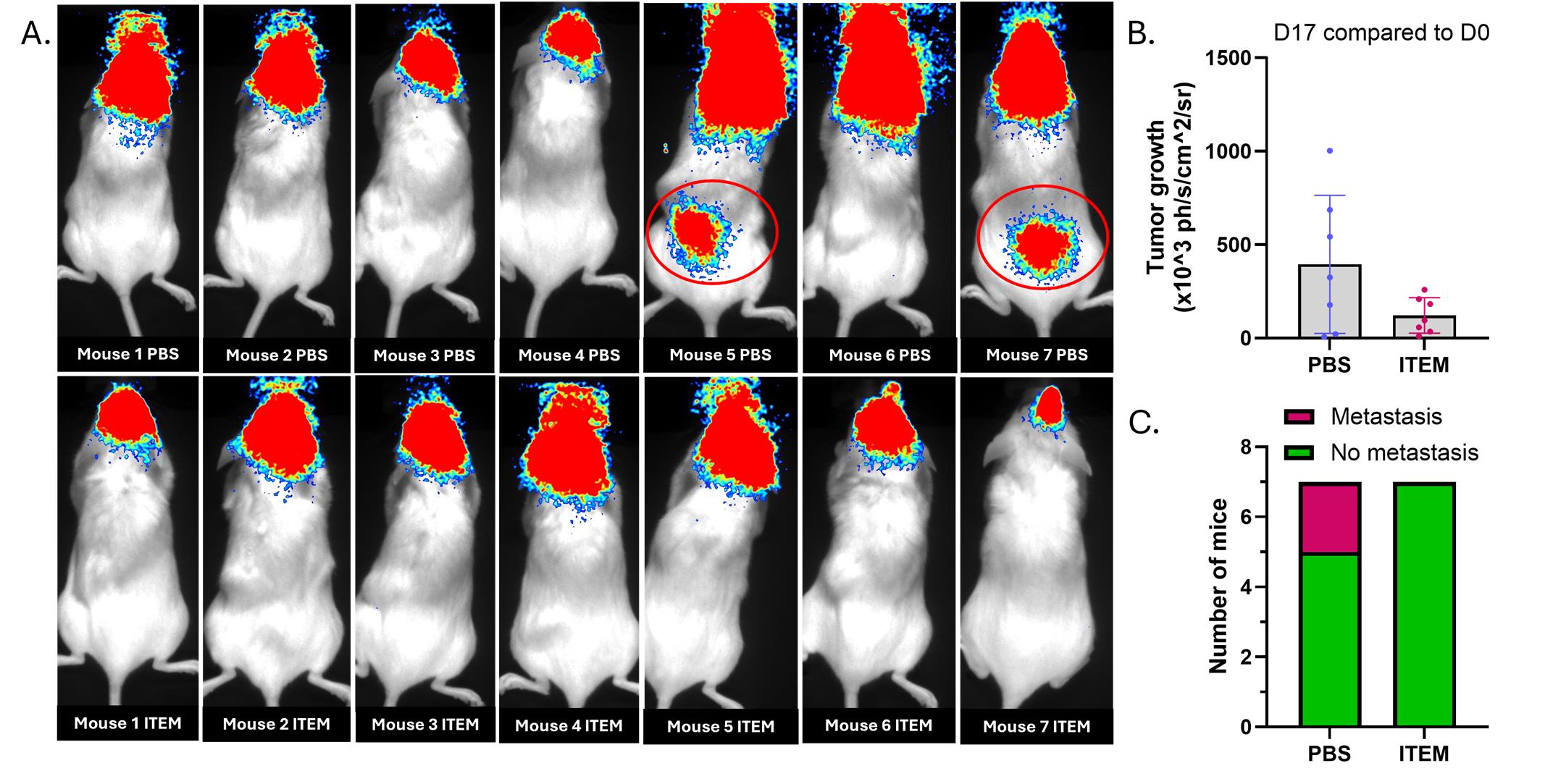 This protocol was validated several times in training mice, but also through a trial conducted on a cohort of 14 mice. For this trial, Nod-scid gamma female mice, aged 11–12 weeks, were inoculated with 50’000 U87-MG Luc2 cells, followed by the implantation of the intracerebral cannula. One week after cell inoculation, mice started four weeks of treatment, with two intra-cannula infusions per week, with mock PBS or cell-based item (ITEM) intended to limit cell dissemination and metastasis development. Figure 7 shows representative data obtained during the trial.