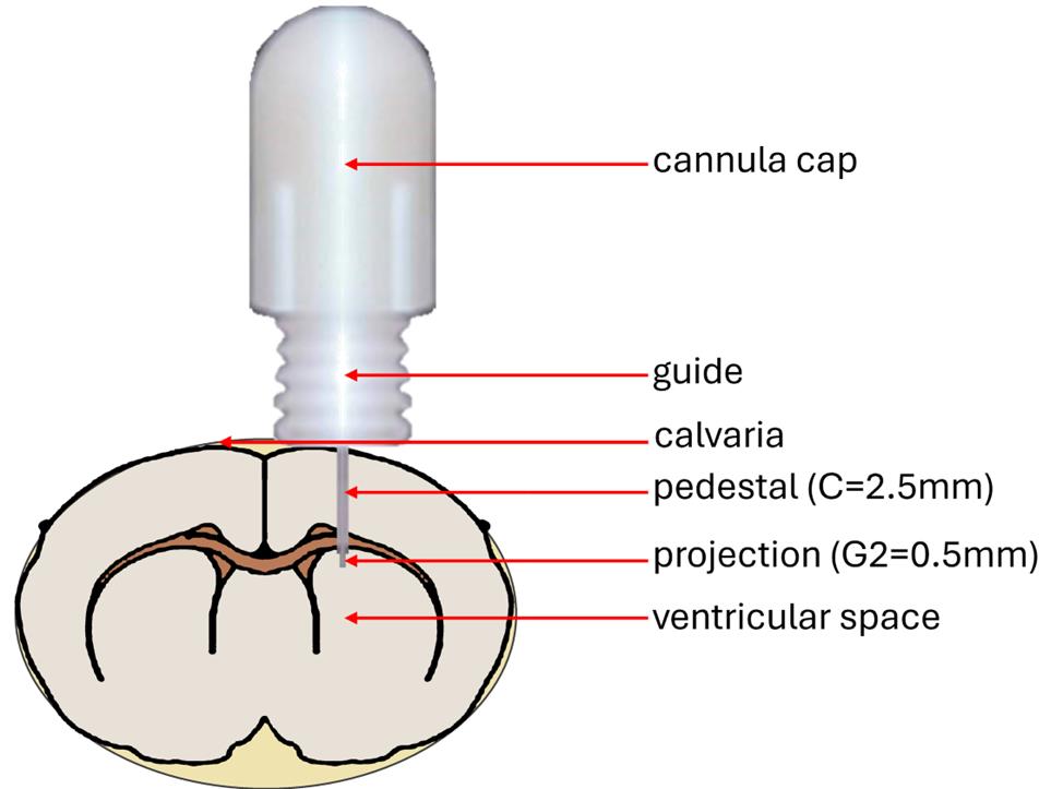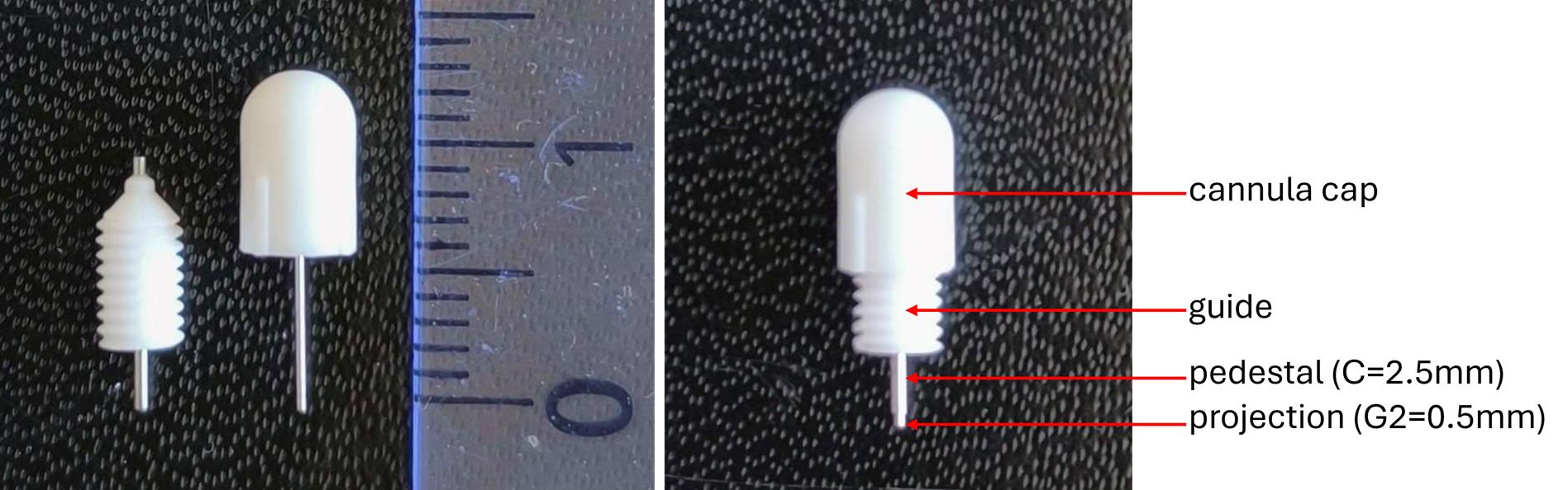 2. The choice of material and the design of the intracerebral cannulas were critical aspects of the experimental setup. Plastic cannulas were preferred over metal ones due to their lighter weight, which helped minimize mechanical stress on the animal. Additionally, plastic is compatible with imaging techniques such as micro-CT or X-ray, as it does not generate artifacts. The selected plastic also needs to withstand effective sterilization procedures; an autoclavable material (up to 121 °C) was therefore deemed optimal. Cannulas from RWD® fulfilled these requirements, and the option for custom manufacturing was a significant advantage. The chosen model featured a pedestal length of 2.5 mm and an internal diameter corresponding to a 26G needle, aligning with the typical depth used for tumor cell inoculation in the murine striatal injection model [6]. The cannula cap included a metal tip designed to prevent guide obstruction. This tip extended 0.5 mm beyond the guide once the cap was in place, thus penetrating the intracerebral space by 0.5 mm when closed.