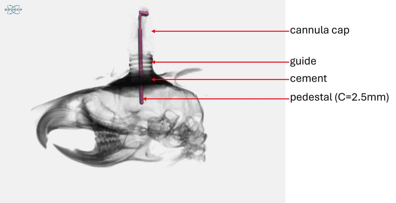 6. Cannula implantation and fixation using G-Cem One cement were validated on several cadavers of 6–8-week-old Balb/cJ mice. To assess intracerebral placement, the heads of two mice were excised and imaged using X-ray micro-computed tomography (Figure 11).