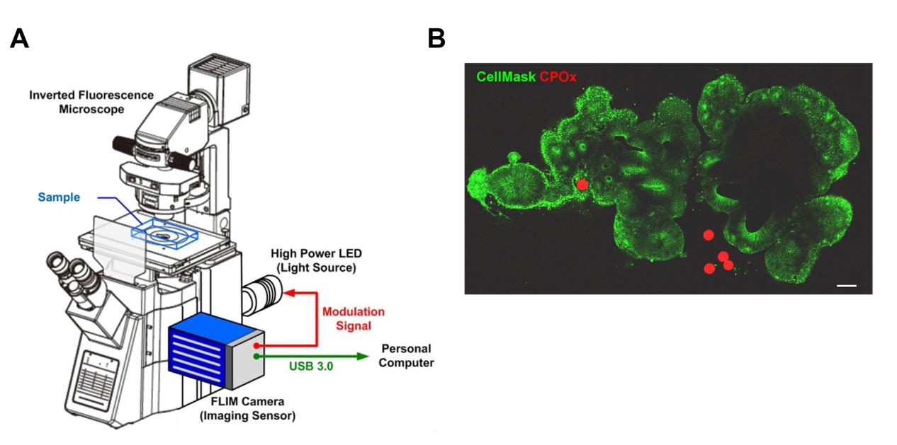 Figure 1. Instrument setup for frequency-domain fluorescence lifetime imaging microscopy (FD-FLIM) and confocal image for validation of CPOx bead localization in human cerebral organoids (hCOs). (A) Schematic of the inverted widefield frequency-domain FLIM system used for live oxygen measurements. The setup includes a 470-nm high-power LED under external modulation, an inverted fluorescence microscope with appropriate excitation/emission filters (Ex 420–490 nm/Em 570–670 nm), and a dual-tap FLIM camera for multi-phase acquisition. (B) Confocal image of a cerebral organoid after 26 days in culture, stained with CellMask (green) to delineate tissue architecture and to localize the oxygen-sensitive CPOx microbeads (red). Scale bar: 100 μm.