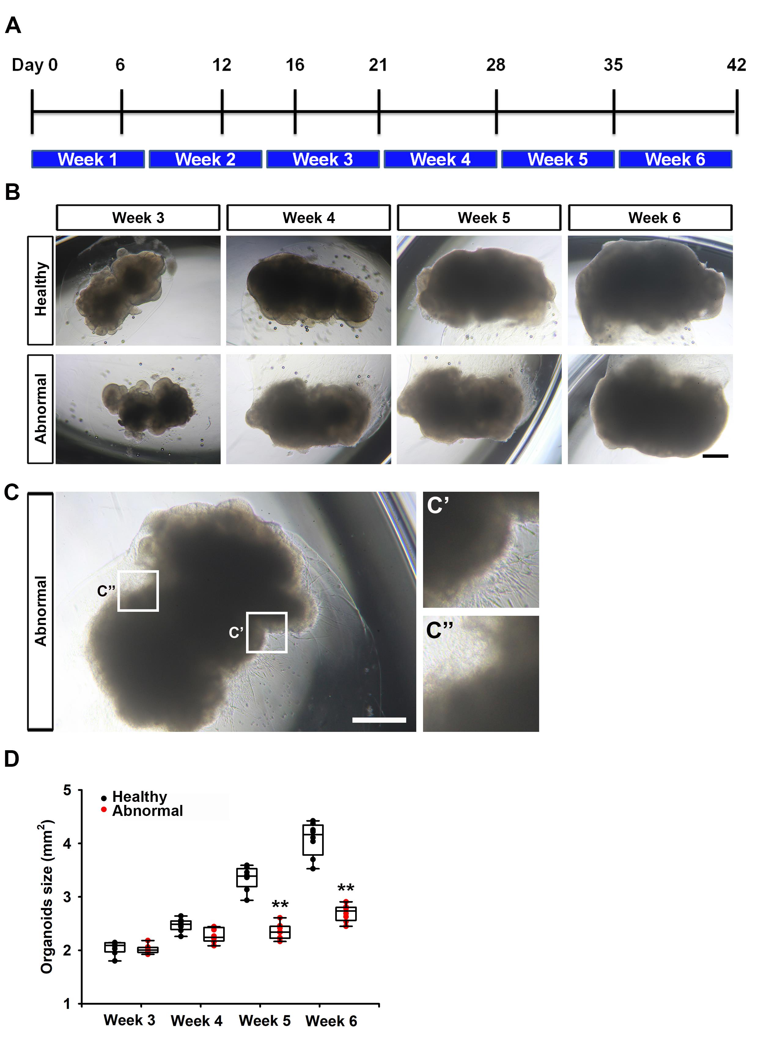 Figure 2. Timeline of human cerebral organoid (hCO) culture and size analysis. (A) Timeline of hCO formation and culture based on the fused cerebral organoid method. (B) Brightfield images of healthy and abnormal hCOs cultured in the Matrigel matrix at different time points (scale bar, 400 μm). (C) Representative brightfield images showcasing the morphological characteristics of abnormal hCOs (scale bar, 400 μm). Crop images from Figure 2C further illustrate these abnormalities: (C') highlights organoids with extended, excessive cell processes or protrusions, and (C'') displays organoids exhibiting irregular, non-smooth boundaries or a failure to maintain a cohesive, spherical structure. (D) Organoid sizes of the hCOs estimated from the captured brightfield images. Data are presented as box plots and mean ± SD with all data points (n = 8).