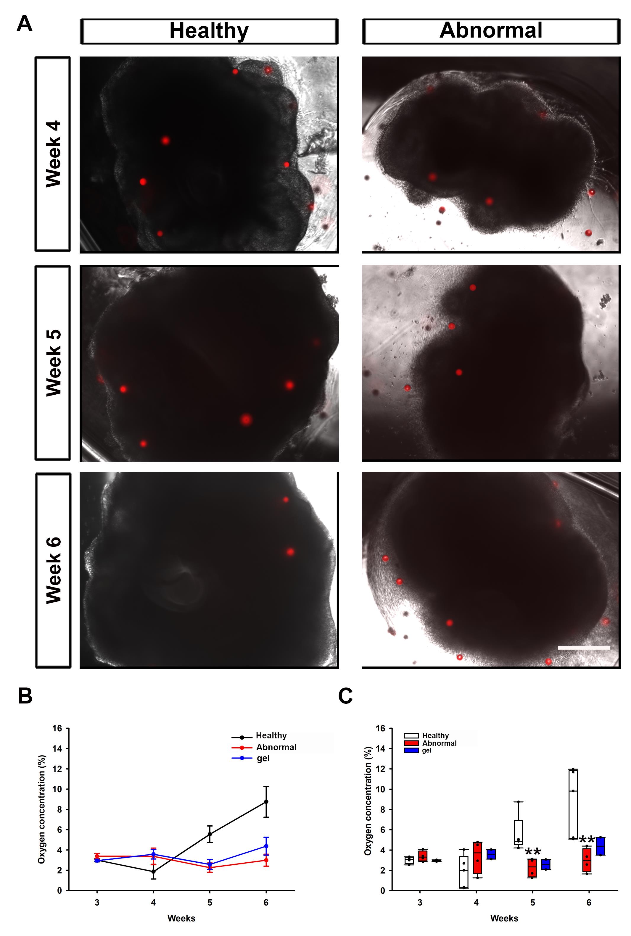 Figure 3. Healthy and abnormal human cerebral organoids (hCOs) with fluorescence oxygen-sensitive microbeads (CPOx) for intra-organoid oxygen tension measurement. (A) Overlaid brightfield and fluorescent images of the healthy and abnormal hCOs cultured with the CPOx microbeads (red) in the matrigel matrix at weeks 4, 5, and 6 (scale bar, 500 μm). (B) Quantitative results of the average oxygen tension values calculated based on the fluorescence lifetime measurement of CPOx beads embedded within the healthy and abnormal hCOs (intra-organoid oxygen tension), or within the matrigel but not embedded within the hCOs (gel oxygen tension). The data are expressed as mean ± SD. (C) Quantitative results of the average oxygen tension values across developmental time points in healthy and abnormal hCOs, as well as within the matrigel but not embedded within the hCOs (gel oxygen tension). An independent T-test was performed for statistical analysis. Data were presented as box plots and mean ± SD with all data points (n = 4, ∗p ≤ 0.05; ∗∗p ≤ 0.01).
