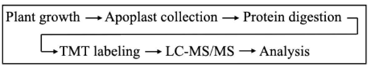 This protocol focuses on the analysis of the Arabidopsis secretory proteome using the TMT 6-plex approach. The protocol consists of the following major steps: apoplast flush collection, protein cleaning, digestion, TMT labeling, MS analysis, and subsequent data analysis using PD3.0 (see Figure 1). The primary benefits of this optimized protocol include (1) rapid collection of apoplast flush in bulk amount with minimal cytoplasmic protein contamination, (2) filter-aided sample preparation (FASP) for protein cleaning, consistently generating high-quality data, (3) the use of spectral libraries for efficient and rapid analysis of MS data, and (4) scalable method up to 10-, 11-, 16-, and 18-plex TMT labeling and analysis. For further details, including the results and analysis process, please refer to Waghmare et al. [21].