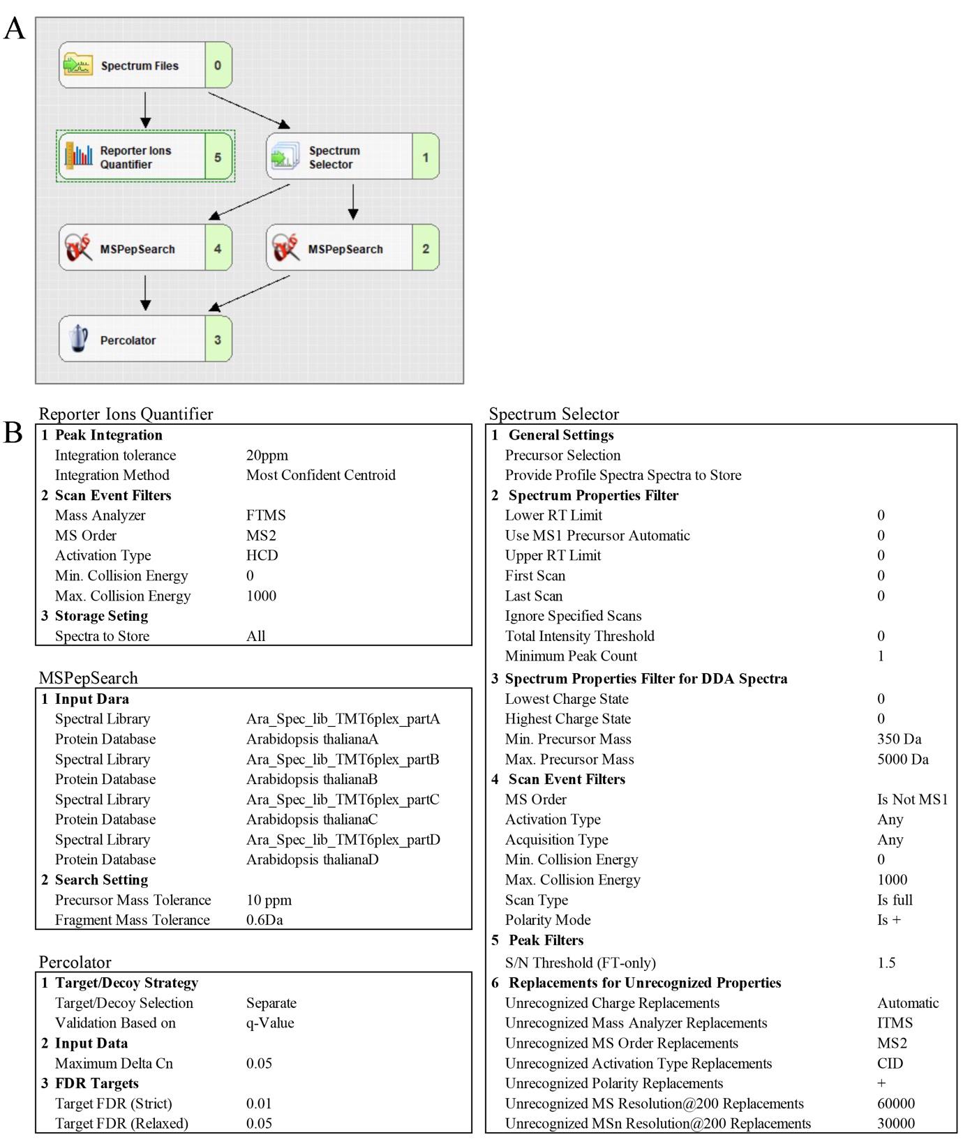 Figure 5. Proteome Discoverer setting for the TMT-based quantitative proteomic analysis of the Arabidopsis proteome. (A) Processing workflow. (B) Parameters for Report Ion Quantifier, Spectrum Selector, MSPepSearch, and Percolator nodes.