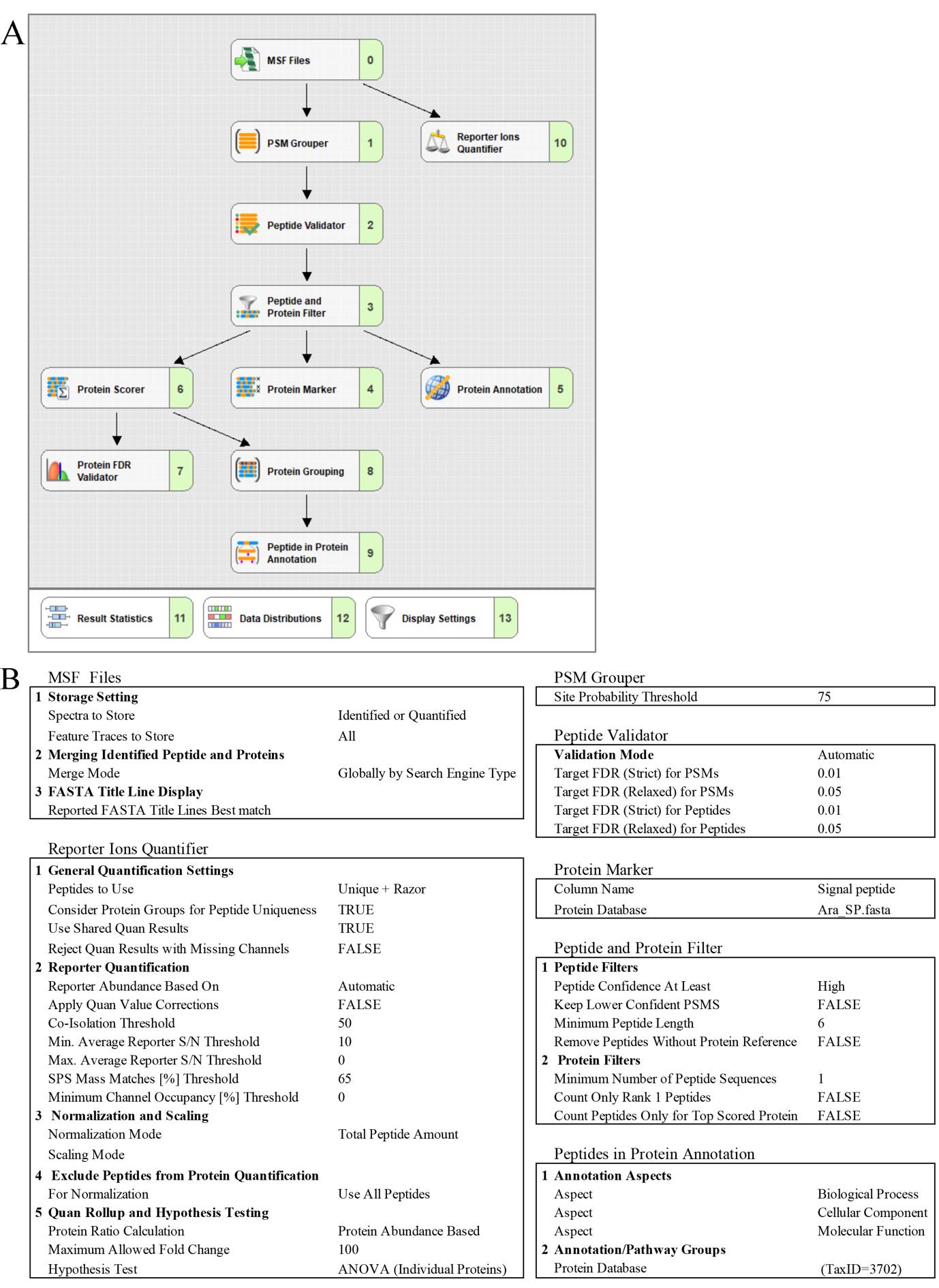 Figure 6. Proteome Discoverer setting for the TMT-based quantitative proteomic analysis of the Arabidopsis proteome. (A) Consensus workflow. (B) Parameters for MSF Files, Report Ions Quantifier, PSM Grouper, Peptide Validator, Protein Marker, Peptide and Protein Filter, and Peptides in Protein Annotation.