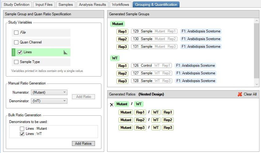 9. In the Grouping and Quantification tab, generate the Sample Groups by clicking the Study Variables (Files, Quan Channels, Lines, and Sample Type). In the example below, we used Lines to generate mutant/WT ratios with a nested design (see Figure 7).