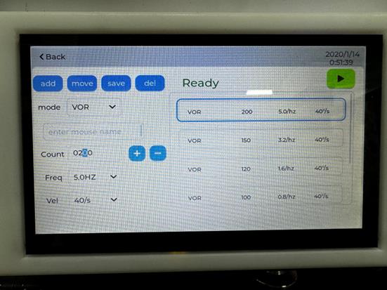 i. Configure the parameters (frequencies, time, and velocities) of aVOR on the electronic touch screen of the instrument (Figure 2).