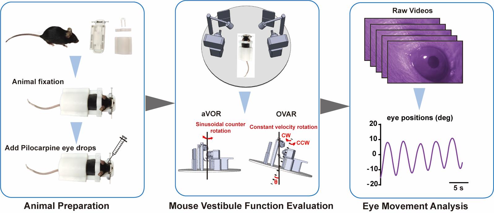 The vestibular system detects changes in head and body position, controls gaze, and facilitates higher-level cognitive perception functions. It comprises three semicircular canals and two otolith organs (the utricle and saccule), which mediate sensitivity to rotational and linear (including gravitational) head movements, respectively. Vestibulo-ocular reflexes (VORs) are commonly used in clinical testing [1] and have also been part of standard vestibular function tests in primate studies [2–4]. VORs can be classified into angular VOR (aVOR), induced by rotational accelerations and primarily driven by signals from horizontal semicircular canal cristae (HSCC) [5,6], and translational VORs (tVORs), such as linear VOR (LVOR) and off-vertical axis rotation (OVAR), which provide otolith stimulus [7,8]. OVAR typically entails constant rotational velocity of the mouse head about an axis that is tilted to the Earth's vertical axis. After achieving steady state rotation, the semicircular canal response decays, and the resulting ocular response originates from otoliths [2,7]. LVOR response is too small to provide reliable estimates of otolith function [9], but OVAR signals are sufficiently robust, and OVAR stimulus could be easily combined with aVOR stimulus into one machine. Therefore, the combination of aVOR and OVAR can form the basis of a complete functional test for the peripheral vestibular organ. The purpose of this protocol is to provide a detailed procedure to encourage further study of the vestibular system's function.