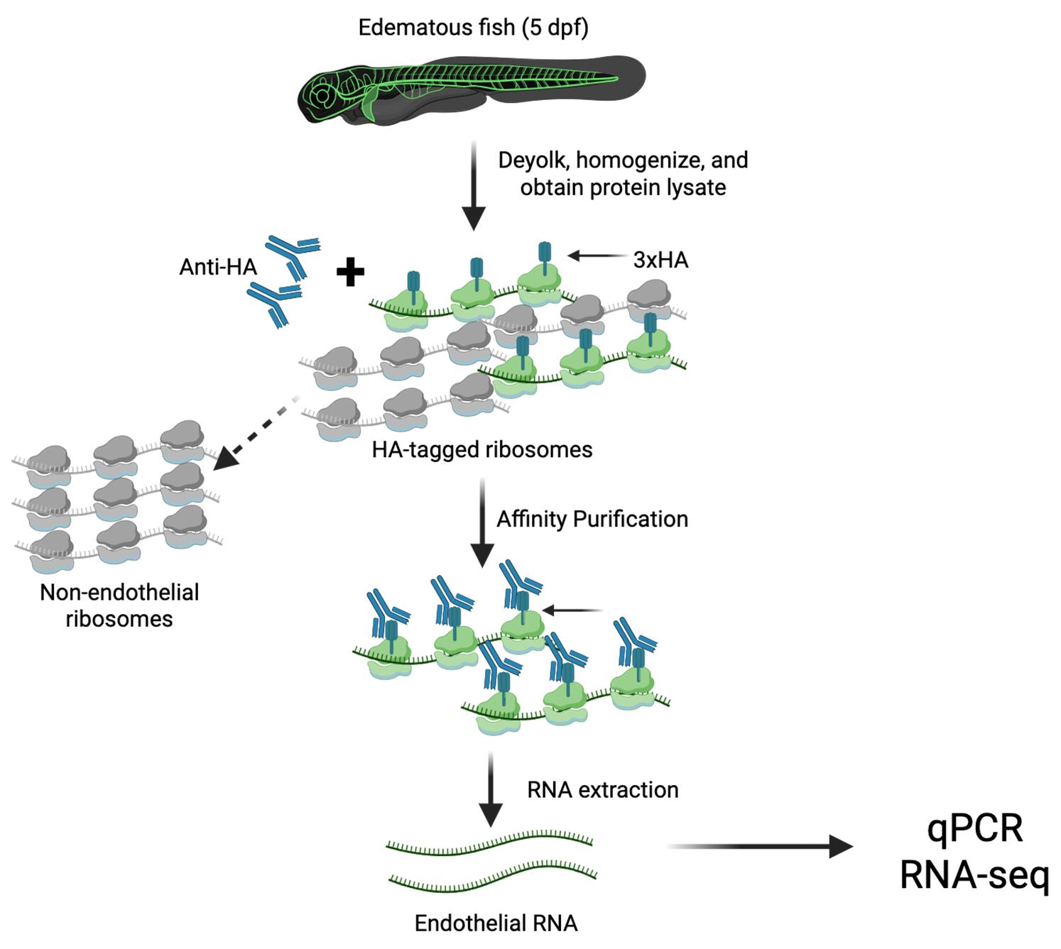 To enable endothelial-specific TRAP in zebrafish, we developed a transgenic line Tg(mrc1a:egfp-2a-rpl10a-3xHA)y723, expressing hemagglutinin (HA)-tagged Rpl10a and eGFP via a viral 2A peptide under control of the endothelial-specific mrc1a promoter [3]. Following osmotic challenge, larvae display vascular remodeling and enable the isolation of actively translating mRNAs from lymphatic and venous endothelial cells. Translatome analysis revealed upregulation of key endothelial genes such as flt4, kdrl, and lyve1b [3]. Coupling TRAP with RNA sequencing allows for comprehensive identification of genes involved in endothelial responses to edema.