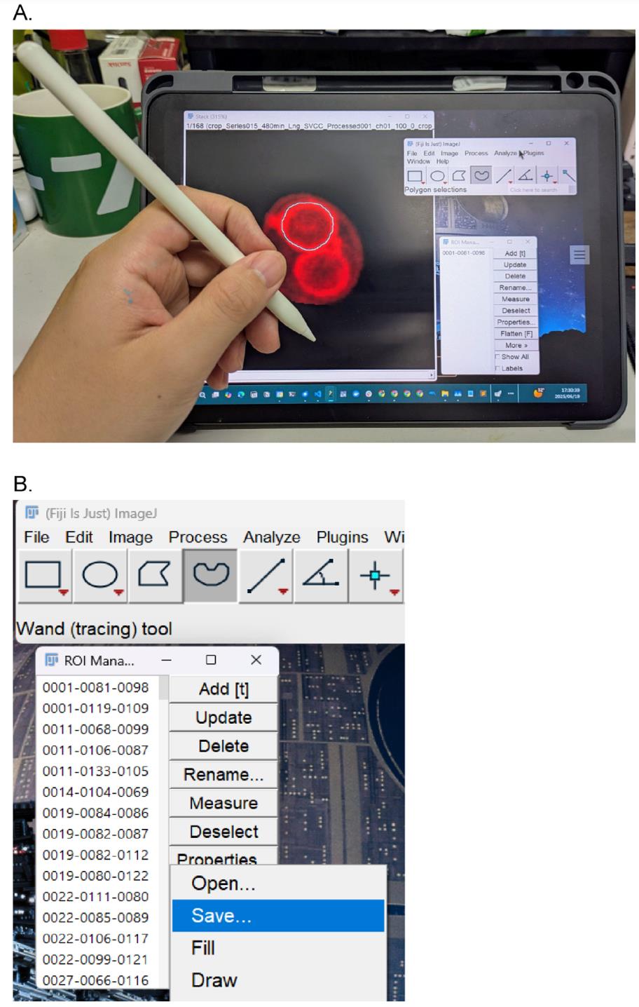 b. Convert ROIs to binary masks. The ROIs saved from ImageJ's ROI Manager as a .zip file (as described in section A3.3) must be converted into binary mask images. To do this, run the provided rois2mask.py script. This script processes the .zip file and generates a separate binary mask image for each ROI, where the annotated region has a pixel value of 1 and the background is 0.