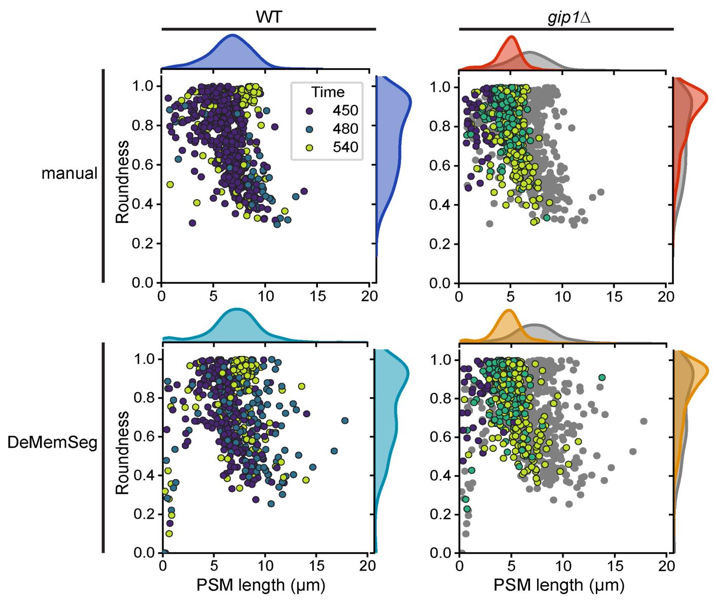 The power of this protocol lies in comparing the distribution of these morphological parameters between different experimental conditions, such as wild type (WT) versus a mutant strain (Figure 4). For example, in our validation study using the gip1Δ mutant, we used this comparative analysis to draw biological conclusions. By plotting PSM length vs. roundness for both WT and gip1Δ populations (Figure 5), a clear shift in the data distribution becomes apparent. The gip1Δ mutant population shows a scarcity of data points in the elongating stage region (long perimeter, low roundness), which can be interpreted as a quantitative indicator of a membrane elongation defect. Furthermore, the mutant's failure to populate the mature/sphere stage region (roundness near 1.0) signifies an impairment in the final closure and maturation steps. By interpreting these shifts in the morphological landscape, researchers can quantitatively characterize the effects of genetic mutations or experimental treatments on membrane dynamics.