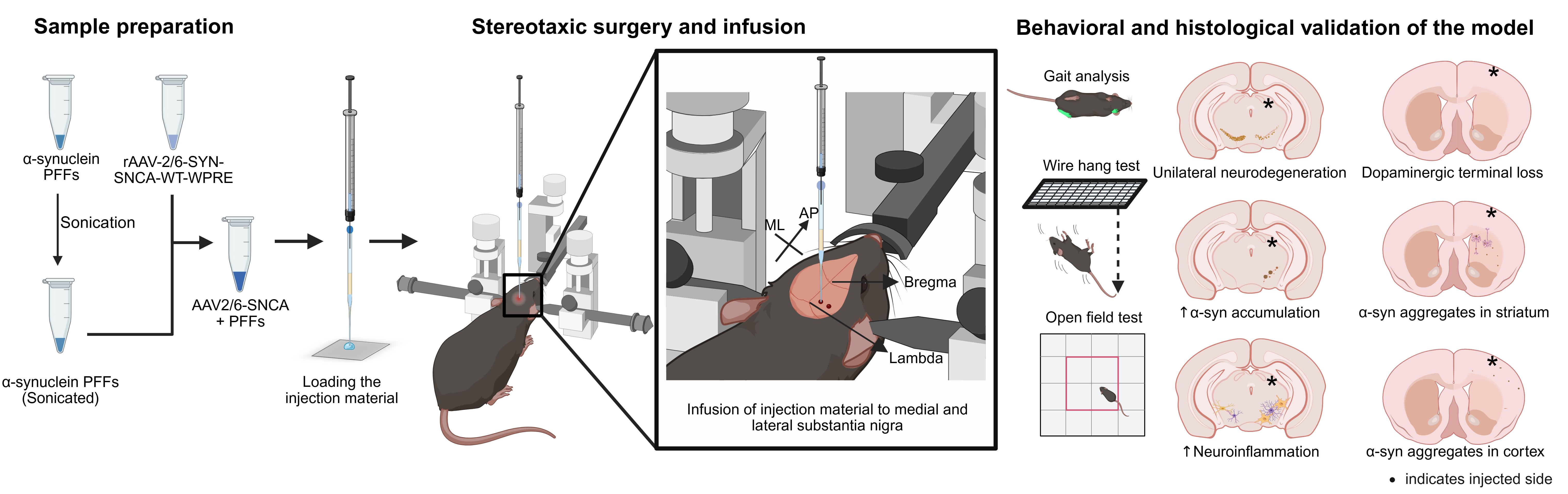 Parkinson's disease (PD) is a complex neurodegenerative disorder primarily caused by the degeneration of dopaminergic neurons of the substantia nigra (SN) [1]. This loss is accompanied by abnormal aggregation of the α-synuclein protein in several brain areas [2]. Despite extensive research in the field, the mechanisms driving PD remain incompletely understood, and effective disease-modifying therapies are lacking. Preclinical animal models that faithfully recapitulate both the neuropathological and behavioral features of PD are critical for advancing mechanistic insights and therapeutic development. Historically, the most widely used rodent models have been based on neurotoxins such as 6-hydroxydopamine (6-OHDA), 1-methyl-4-phenyl-1,2,3,6-tetrahydropyridine (MPTP), or rotenone. These models produce a relatively rapid and severe loss of dopaminergic neurons accompanied by behavioral deficits but fail to capture the slow, progressive characteristics of human PD and its important pathological hallmarks such as α-synuclein aggregation [3–9]. To overcome these limitations, transgenic and viral vector-based approaches involving various PD-associated genes or their mutations have been developed [10–12]. Recombinant adeno-associated viral (rAAV) vectors expressing human α-synuclein are among the most widely used strategies and can produce progressive neurodegeneration and α-synuclein pathology [13–15]. While rAAV–based approaches offer the advantage of precise targeting of α-synuclein expression to specific brain regions and even particular cell types through the use of cell-selective promoters or tailored AAV serotypes, achieving strong pathological features such as protein aggregation, enhanced neuroinflammation, and profound motor impairments typically requires very high viral titers. This, however, introduces concerns of nonspecific viral toxicity and limits physiological relevance, since such elevated levels of α-synuclein are not observed in sporadic PD patients.