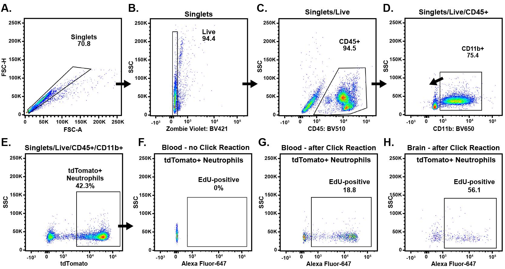 Data collected using flow cytometry should be processed and analyzed with the appropriate controls for compensation and fluorescence-minus-one samples. EdU signal and gating should be determined by comparing EdU-labeled samples to samples not injected with EdU (but the sample was processed identically), as well as samples where the click reaction was omitted. The click reaction will mute the signal from genetically encoded fluorophores, and gates should be adjusted accordingly. Similarly, for fluorescence microscopy, samples should be analyzed alongside replicates collected from animals not injected with EdU, as well as samples that did not undergo the click reaction. For all methods, the fluorescence intensity of fluorescent proteins will be reduced and, as such, should be quantified before (or without) the click reaction. After the click reaction, fluorescent proteins may have reduced fluorescence but should still be fluorescent enough to identify positive populations using fluorescence microscopy and flow cytometry, at least for tdTomato (described here) and eGFP [13]. Researchers may need training in flow cytometry and image analysis software and methods to fully interpret their data.