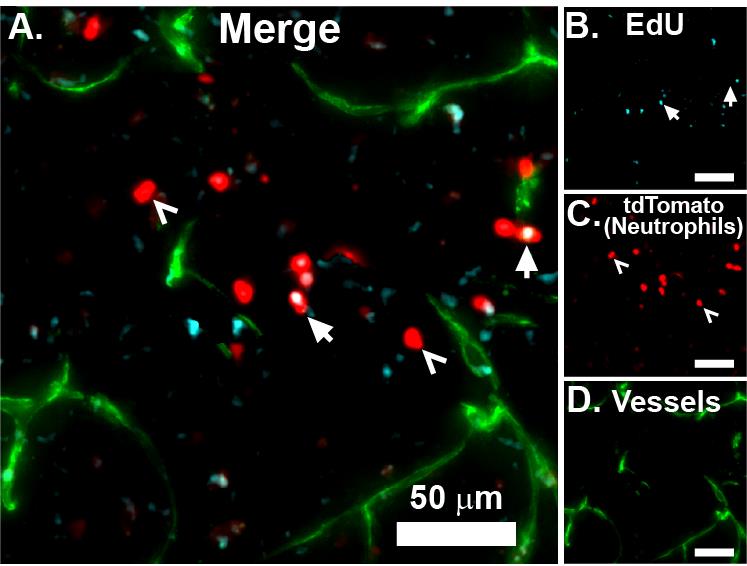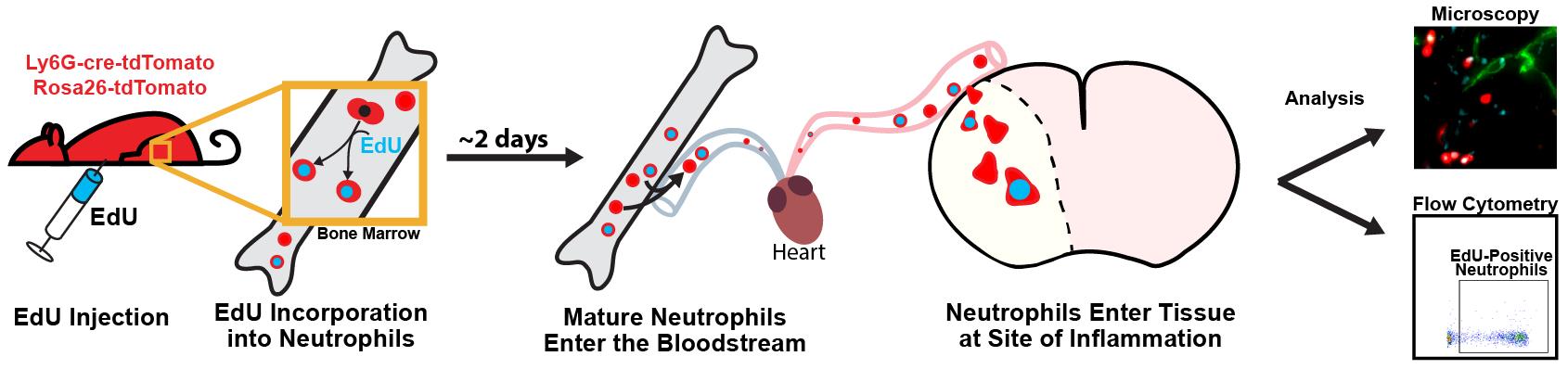 Leukocytes play a key role in the body’s inflammatory response, and understanding the patterns and activity of leukocyte recruitment yields valuable insight for therapeutic interventions. Cell-tracking tools like the nucleotide analogues 5-ethynyl-2’-deoxyuridine (EdU) and 5-bromo-2’-deoxyuridine (BrdU) help to reveal the behavior of leukocytes, as well as many other cell types, across a wide range of pathological processes [1,2]. With EdU labeling, cells incorporate EdU into their DNA during replication, mimicking the nucleoside thymidine. A copper(I)-catalyzed reaction then allows for a fluorescent azide to attach to the alkyne group (click chemistry) on EdU, enabling the detection of dividing cells [2,3]. This is similar to BrdU; however, EdU has greater utility for multiplexed staining and minimizes the disruption of protein epitopes because it does not require DNA denaturation for visualization [4,5]. EdU can be injected intraperitoneally for rapid labeling or given through food or drinking water to prolong the labeling window. EdU is incorporated into the DNA of cells during the S phase of the cell division cycle. As such, for myeloid cells like neutrophils and monocytes, it is incorporated into immature precursors in the bone marrow, which enter the bloodstream after maturation [6–8]. EdU injections could be staggered over several hours or days to label a higher proportion of cells, if desired [9]. One current limitation with EdU compared to other cell-labeling protocols, such as carboxyfluorescein succinimidyl ester or fluorescent antibodies, is that EdU cannot be visualized for live-cell imaging, since the sample must be fixed to detect the EdU signal. Additionally, high concentrations of EdU or prolonged exposure could have cytotoxic effects and may impact cell viability [10].