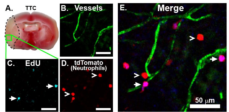 Figure 4. Imaging EdU with confocal microscopy. EdU was injected i.p. one day before subjecting the mouse to transient middle cerebral artery occlusion (tMCAO) surgery. After 24 h, 50 μg of PECAM-labeling antibody was injected retro-orbitally. The mouse was sacrificed 30 min later, and the brain was recovered, sliced into 1 mm sections, stained with TTC (A), and fixed and processed for EdU detection as described above. The entire 1 mm slice was mounted in a coverslip dish and imaged with confocal microscopy for vessels (B, green), EdU (C, cyan), and tdTomato (D, red), shown merged in (E). EdU-labeled Catchup neutrophils readily infiltrate into the infarcted brain and can be easily distinguished from non-labeled Catchup neutrophils. Arrows indicate EdU-positive neutrophils, and open arrowheads indicate EdU-negative neutrophils. For visualization using a different Azide Plus fluorophore combination, please see [13] https://pubmed.ncbi.nlm.nih.gov/40260638/. All scale bars are 50 µm.