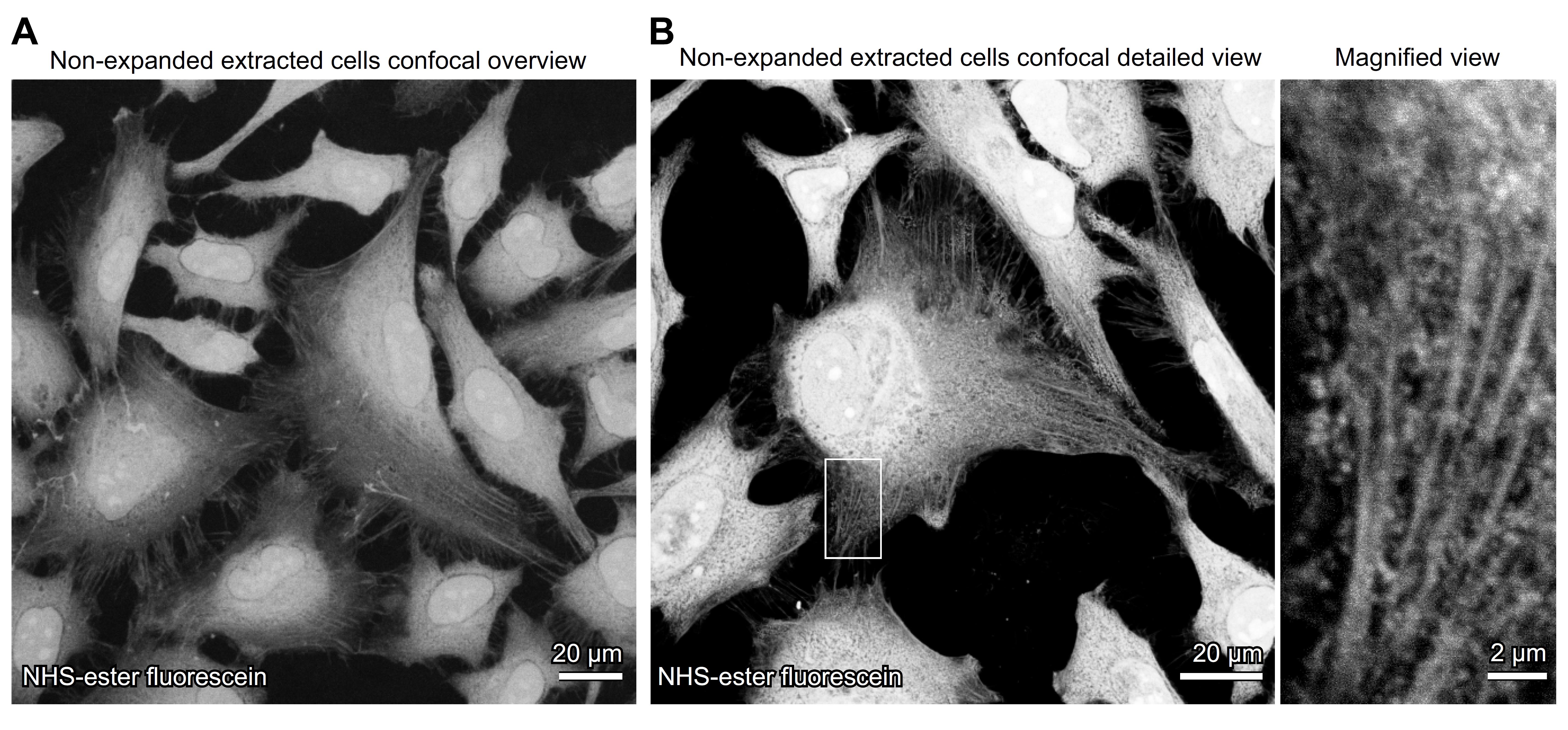 The extraction procedure was validated by observing the non-expanded, extracted cells with NHS-ester under the microscope. Objects closely resembling cytoskeletal elements were easily recognized, which validates the extraction procedure.