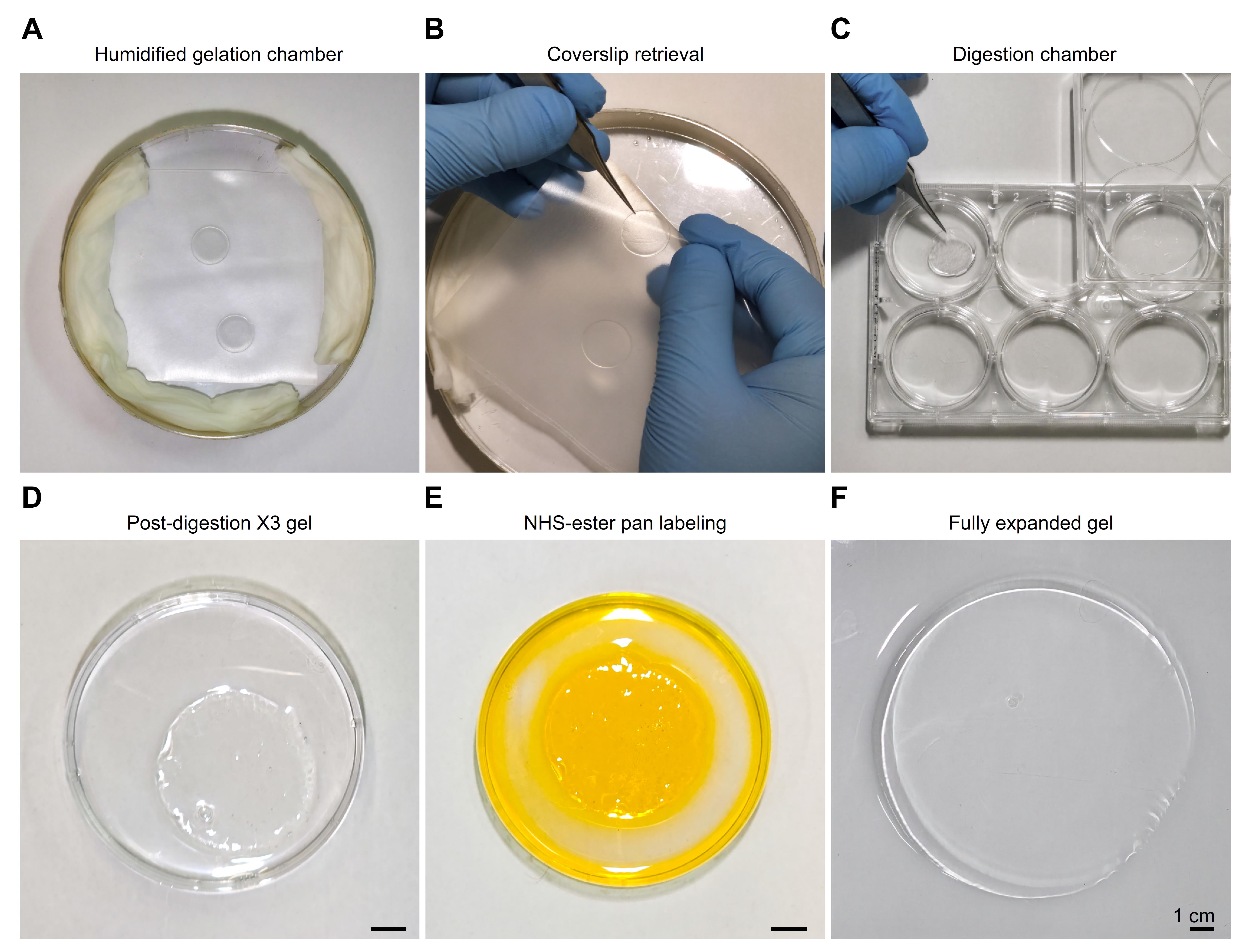 Note: A representative gel stained with fluorescein NHS-ester is shown in Figure 2E. Staining at this intermediate stage, after digestion and prior to full expansion, allows efficient dye penetration while markedly reducing the amount of fluorescent dye needed.