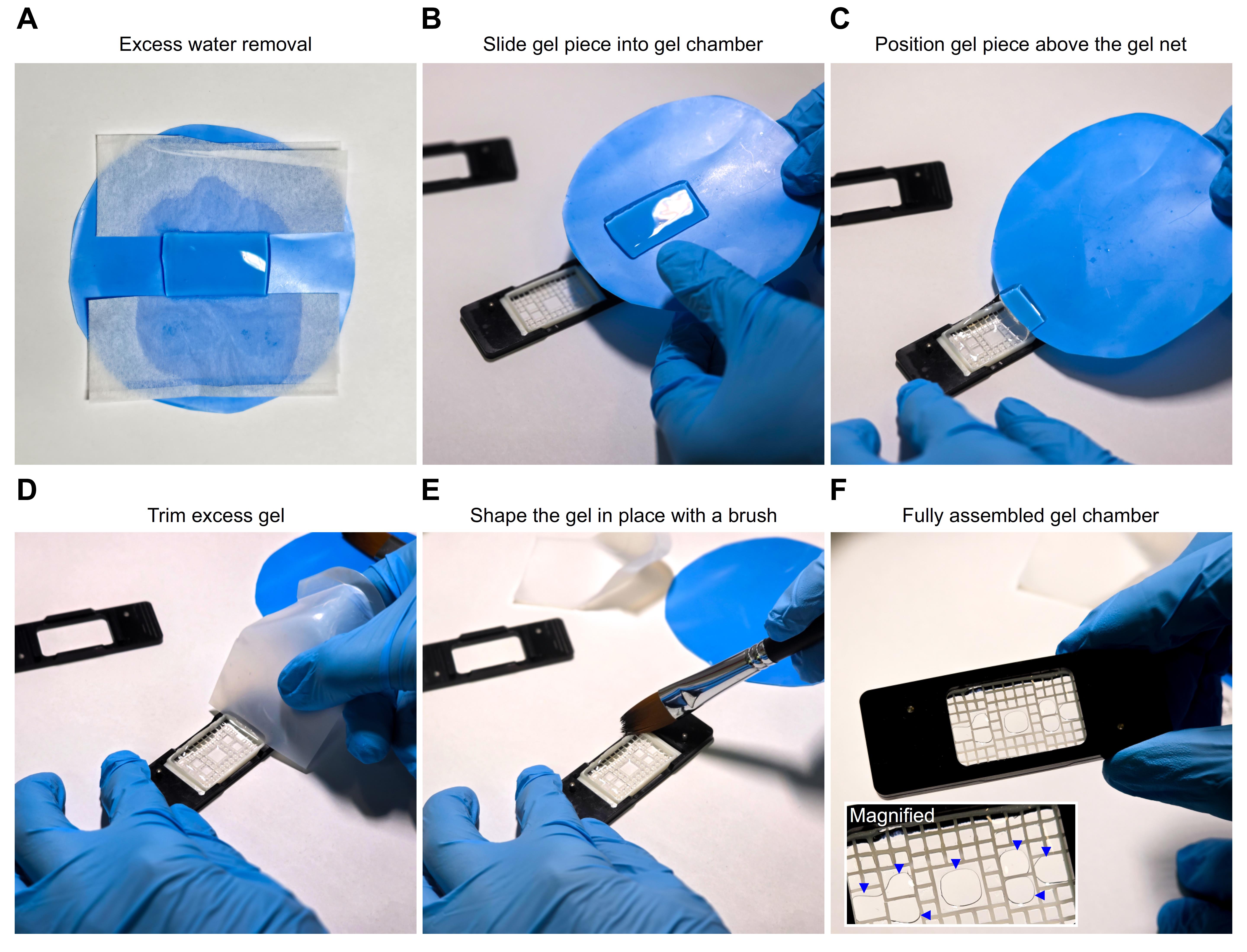 Figure 3. Assembly of the gel chamber for stable mounting of expanded samples during high-resolution imaging. (A) A rectangular gel piece was placed on a flat weighing tray (blue), and excess water was removed from two opposite sides using a nitrocellulose membrane. (B) The appearance of the gel after blotting excess water is shown. (C) The gel was carefully positioned on the supporting net by gradually sliding it into place. (D) The gel was cut slightly larger than the net, as recommended to ensure full coverage, and the excess was trimmed with a piece of the weighing tray to achieve a precise fit. (E) Excess gel fragments were then removed from the chamber using a paintbrush. (F) Finally, the top lid was placed onto the bottom frame, securing the net and gel to provide stability for high-resolution imaging. The blue arrows shown in the magnified region indicate air-free contact areas between the gel and the coverslip, which define the regions suitable for imaging. Images were acquired with a Samsung Galaxy S25 Ultra smartphone, and angle distortion and lighting were corrected using Adobe Lightroom v8.4, 2025.