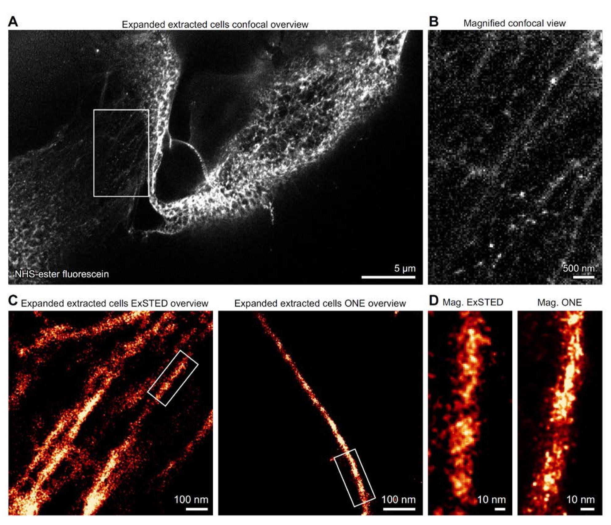 Figure 4. High resolution imaging of NHS-ester labeled extracted microtubules. (A) Confocal image of X10-expanded microtubules directly labeled with fluorescein NHS-ester. (B) A magnified region of the sample is shown for improved visualization. (C) Overviews of microtubules imaged using ExSTED (left) and ONE microscopy (right). (D) A magnified view of a single microtubule shows that comparable images can be obtained with these different imaging techniques; N = 2 independent experiments. Measurements and further validation of the imaged cytoskeletal elements are provided in [15].