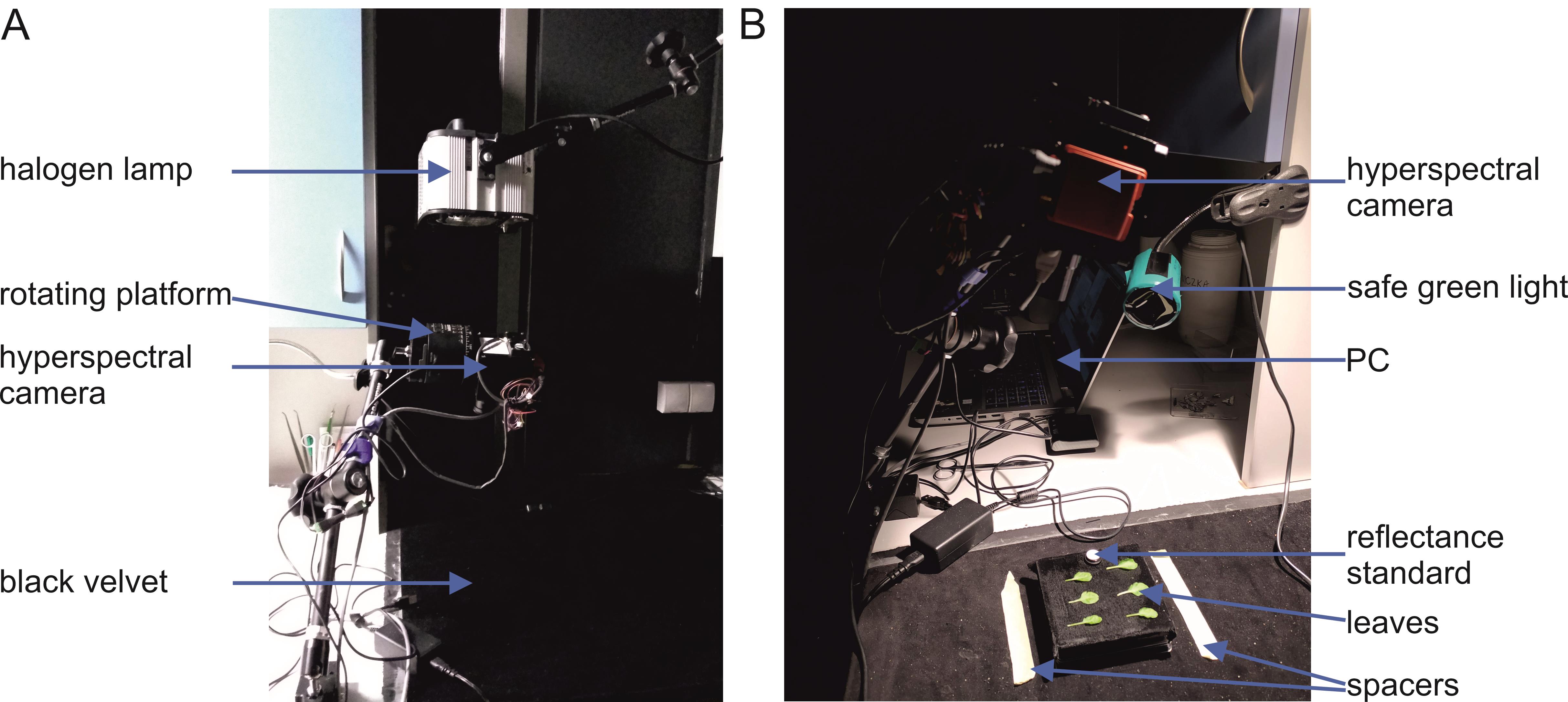 Figure 2. Experimental setup used to detect chloroplast movements based on leaf reflectance recorded with a hyperspectral camera. (A) The halogen lamp is located above the hyperspectral camera, which is mounted on a rotating platform. The camera must not shadow the plane of observation. The field of view of the camera is covered with black velvet. (B) The location in which the plate with leaves is placed should be marked with spacers, e.g., tape strips. A green safe light is used for performing all the experimental steps before the halogen light is switched on. The monitor of the PC should also be covered with green foil.