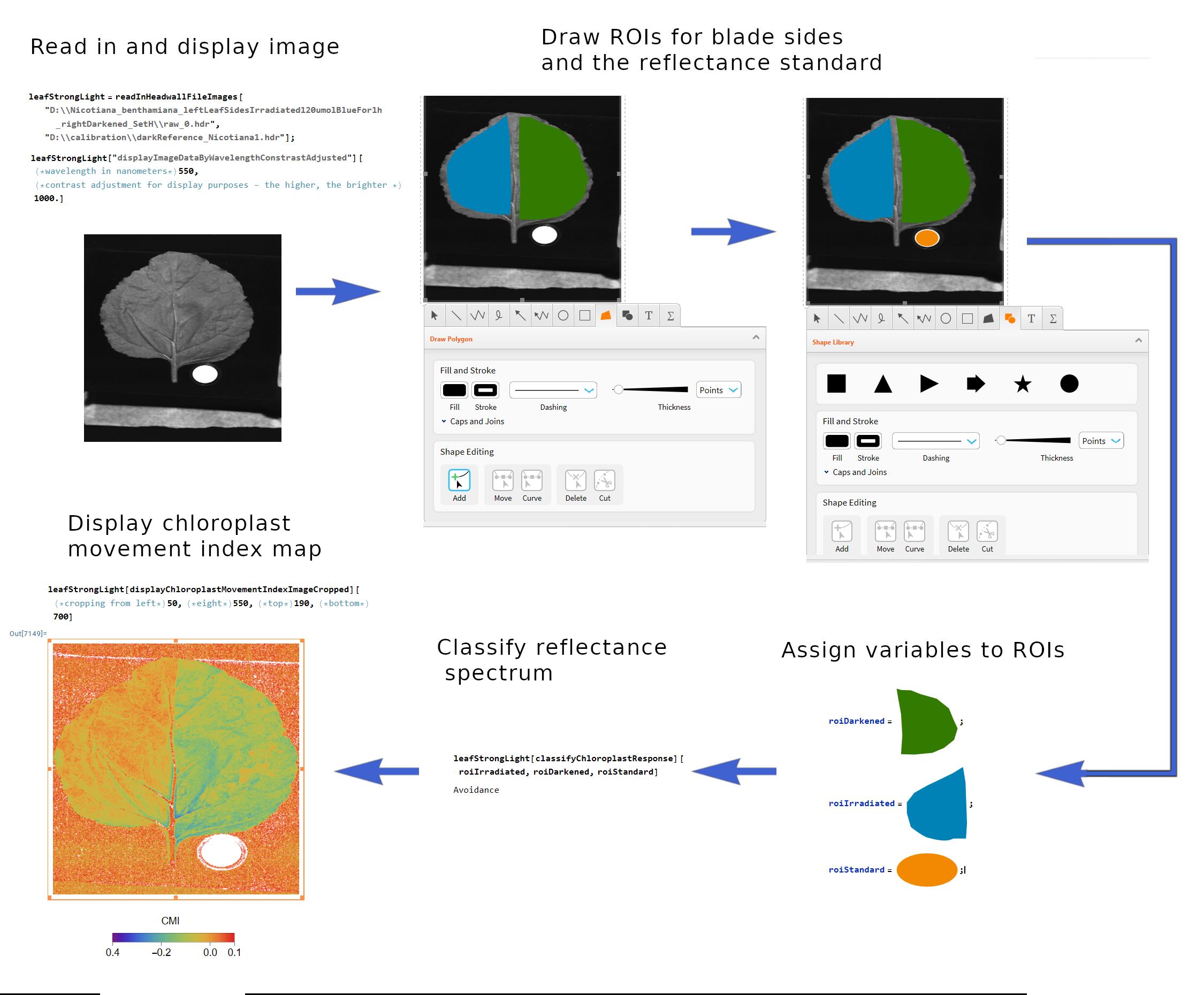 In this section, leaves will be classified according to the chloroplast positioning, using a pretrained convolutional neural network. The network is available in the software package HyperspectralImageProcessing.m, written by us in Mathematica (Wolfram Research, USA) and distributed through GitHub. The package allows for classification of leaves based on both single reflectance spectra as well as differences in reflectance spectra between irradiated and darkened leaf halves. Use the latter approach when following this protocol. A free introduction to Mathematica can be found online [19]. The core command of the package, readInHeadwallFileImages, creates an object representing a hyperspectral image recorded with a Headwall camera (Figure 3). It can be acted upon by additional functions that allow for the extraction and display of spectra from custom regions of interest. The list of functions available in the package can be produced with the command Names["HyperspectralImageProcessing`*"]. For each function, the details about its parameters and returned values can be obtained using the Information command. For example, executing Information[readInHeadwallFileImages] will yield usage information for the readInHeadwallFileImages function.