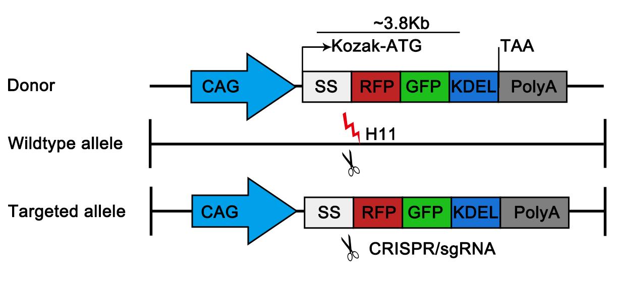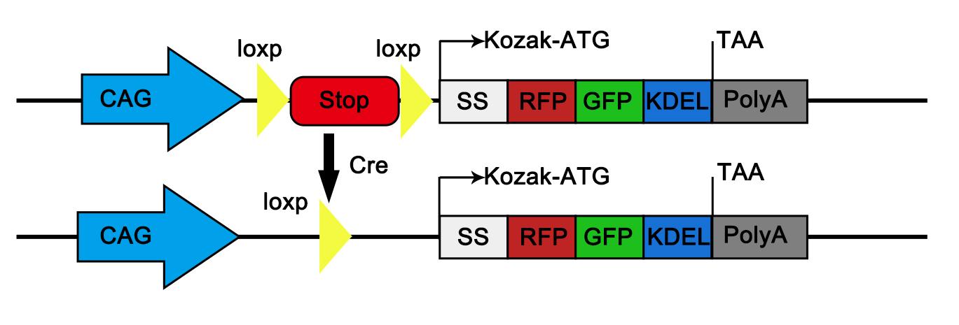 While overexpression of ER-lumen tandem fluorescent proteins functions reliably as ER-phagy reporters in vitro, their in vivo efficacy for faithful visualization of ER-phagy and architecture without adverse effects remains uncertain. To address this, we construct the CA-ER-TRG model, a Cre-inducible variant, by integrating the Cre-loxP recombination system with the ER-TRG gene cassette. This approach allows for the insertion of the ER-TRG gene into the genome at a specific locus under the control of a Cre-responsive promoter. Upon introduction of Cre recombinase, the loxP sites are recombined, enabling the expression of ER-TRG in a spatiotemporally controlled manner. This precise genetic engineering strategy minimizes potential artifacts associated with constitutive reporter expression [6].