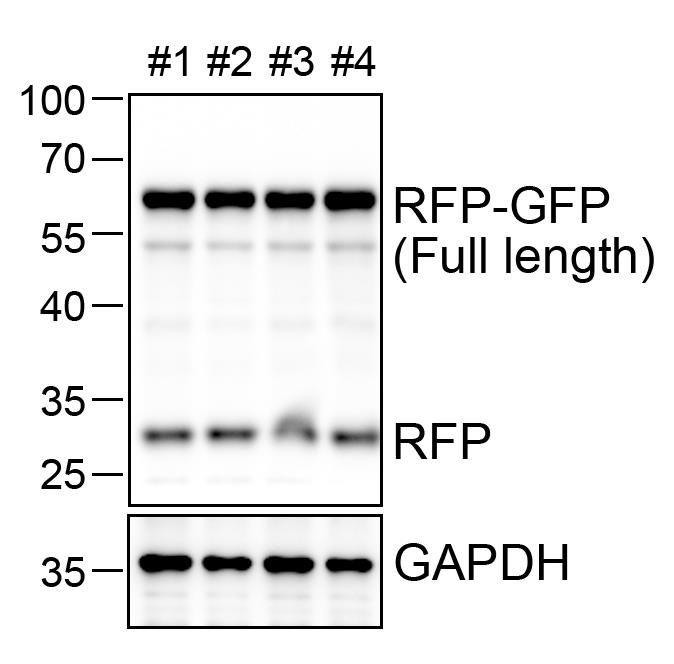1. During tissue lysis, both the tissue and tissue lysis buffer should be kept at a low temperature to prevent protein degradation in the tissue; otherwise, it will lead to the weakening of the full-length RFP-GFP band and the enhancement of the cleaved RFP band. Fresh tissue samples are recommended for this experiment.