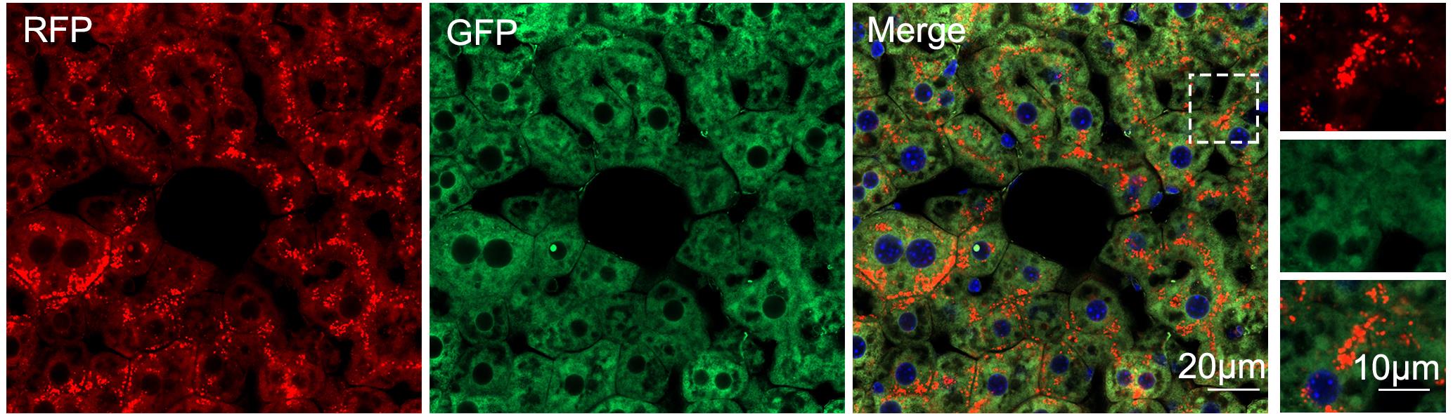 Note: As shown in Figure 9, ER-phagy in the liver was assessed using the dual-fluorescence reporter in inducible ER-TRG mice. Upon starvation, a marked increase in RFP-positive, GFP-quenched puncta was observed, indicative of ER fragments delivered to acidic lysosomes. Quantitative analysis of these puncta (e.g., relative intensity or area) confirmed a significant increase, demonstrating elevated ER-phagy flux during starvation.