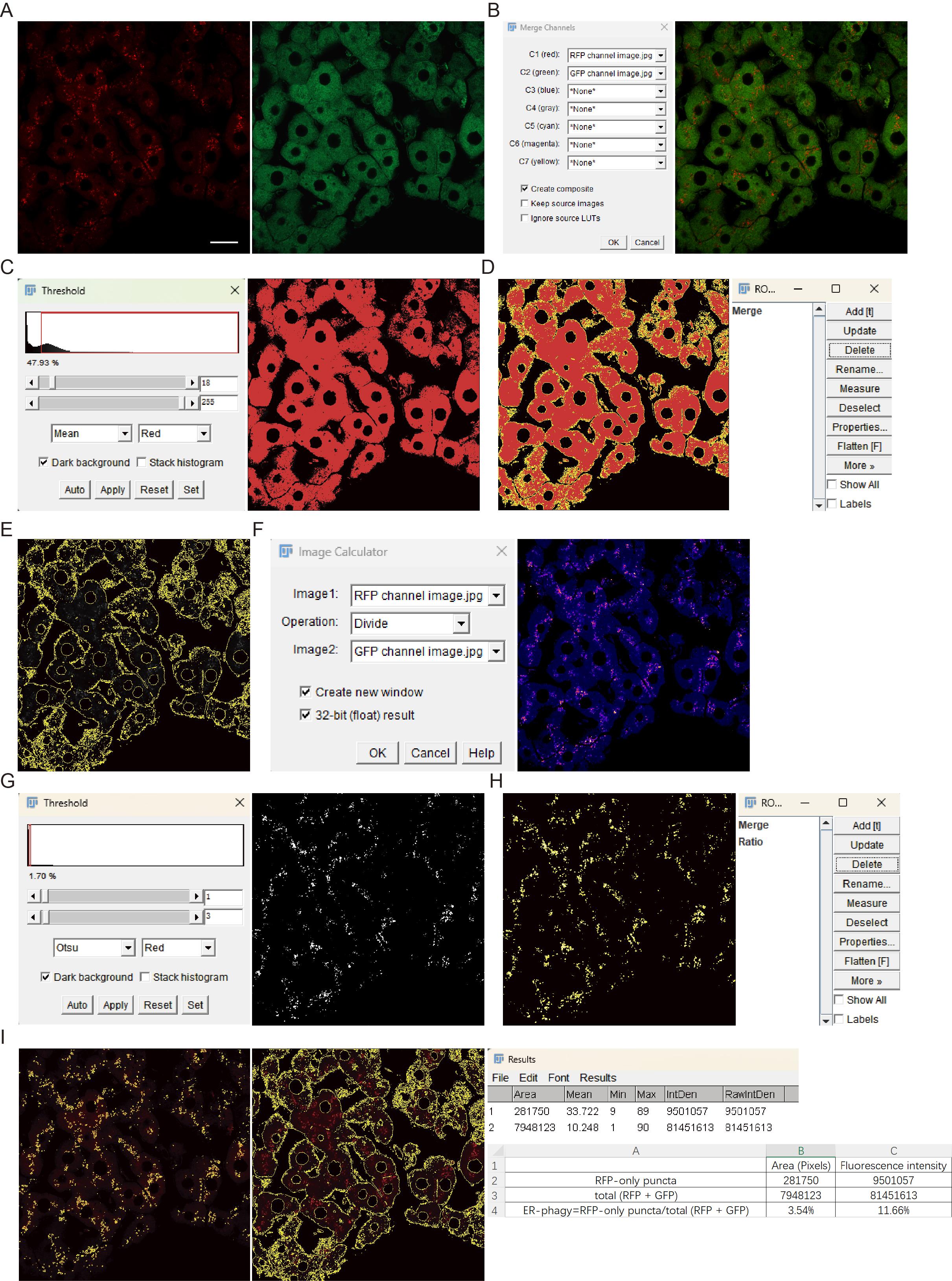Figure 8. Image processing workflow for fluorescence quantification of ER-phagy. (A) Images of RFP and GFP channels. (B) Generation of merged (RFP + GFP) image: C1 corresponds to the RFP channel and C2 to the GFP channel. (C) Threshold interface and image outlining the merged (RFP + GFP) signal region. (D) Selection of the merged (RFP + GFP) signal region and the ROI Manager with the saved corresponding ROI. (E) Result of applying the merged (RFP + GFP) ROI to the RFP or GFP channel images. (F) Image Calculator interface and the resulting ratiometric (RFP/GFP) image pseudocolored with the Rainbow RGB LUT. (G) Threshold interface and binarized image derived from the ratio (RFP/GFP) image. (H) Creation of a ratio area in the ROI manager by outlining the RFP-only signal. (I) ROI masks, generated based on the ratio (RFP/GFP) and merged (RFP + GFP) signals, were applied to the RFP channel to measure area and fluorescence intensity. ER-phagy levels are quantified from these measurements. Scale bar = 20 μm.
