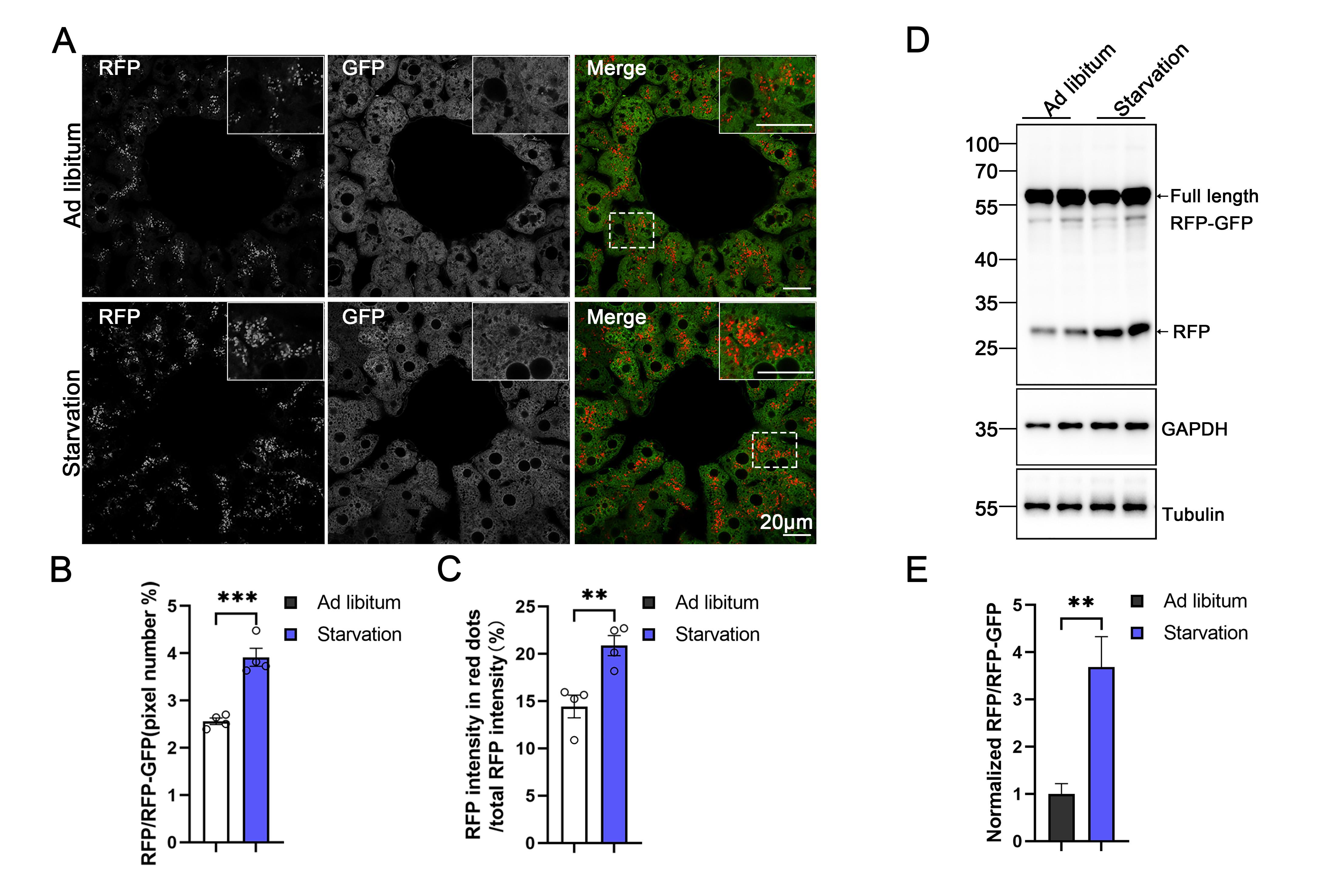 Figure 9. Monitoring ER-phagy induction in the liver upon starvation by an increase in the RFP/GFP ratio. (A–C) Representative confocal images and quantitative analysis in the liver of inducible ER-TRG (Rosa CreERT2+/−; LSL-RFP-GFP-KDEL+/−) mice under starvation. Quantitative analysis revealed the ratio of RFP to total area (RFP+GFP) and the fluorescence ratio of RFP to total RFP intensity by ImageJ on a pixel-by-pixel basis. Values were stated as mean ± SEM (n = 4 per condition). Statistical differences were evaluated using Student’s t-test. **P < 0.01, ***P < 0.001. Scale bar: 20 μm. (D–E) Analysis of ER-phagy levels in the liver of inducible ER-TRG (Rosa CreERT2+/−; LSL-RFP-GFP-KDEL+/−) mice by immunoblotting under ad libitum feeding and starvation conditions. Mice underwent a 16-h fasting process with free access to water, while control mice had ad libitum access to both food and water. Mice were treated with tamoxifen for 2 or 3 days, and samples were analyzed after 5 or 7 days. The immunoblots are quantified in panel D. Values were stated as mean ± SEM (n = 4 per group). Statistical differences were evaluated using Student’s t-test. **P < 0.01. Scale bar: 20 μm.