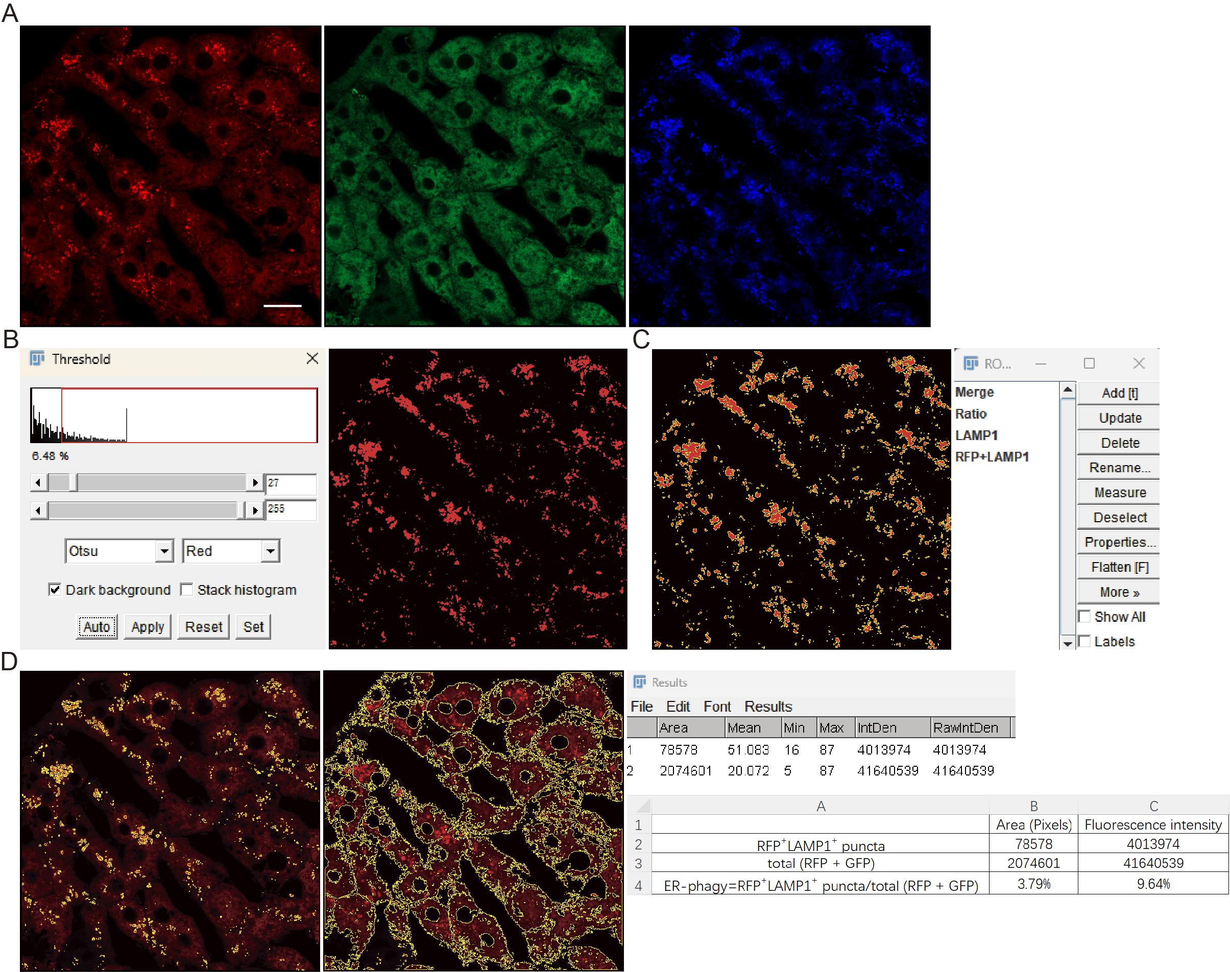 Figure 10. Image processing workflow for fluorescence quantification of ER-phagy with lysosomal marker signals. (A) Images of RFP, GFP, and lysosomal marker (e.g., LAMP1) channels. (B, C) Thresholding and ROI generation. Panel B shows the thresholding interface used to outline the LAMP1-positive signal region. Panel C displays the resulting combined ROI (RFP + LAMP1) in the ROI Manager from the intersection of the ratio (RFP/GFP) and LAMP1 ROIs. (D) The combined ROI and the merged (RFP + GFP) ROI were applied to the RFP channel image. The pixel area and fluorescence intensity within these ROIs were subsequently measured. Scale bar = 20 μm.