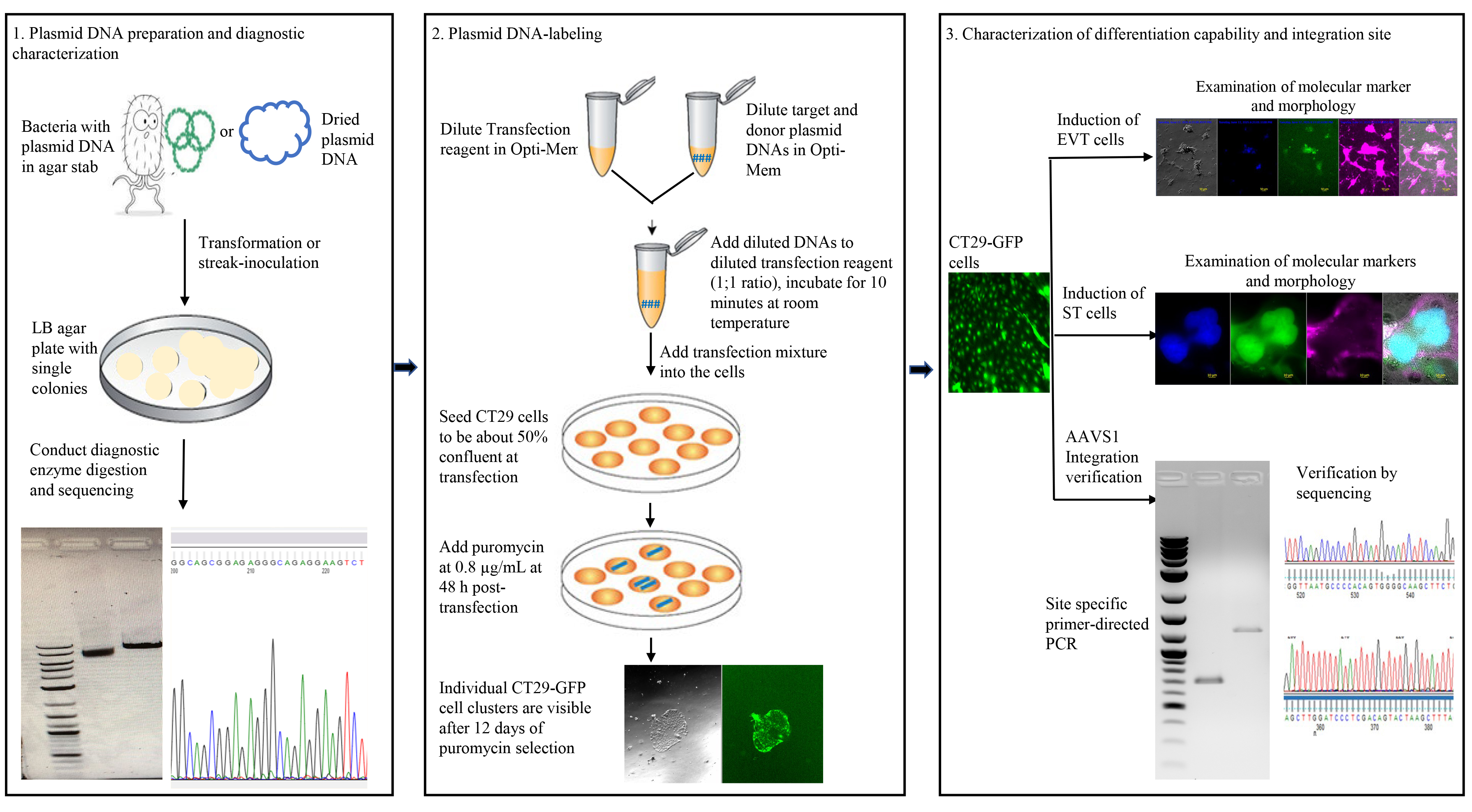 In our experiments, we have validated the protocol by examining the labeled cells’ molecular markers and their functional capacity to differentiate into EVT and ST cells. Additionally, we confirmed the AAVS1 integration of the GFP reporter gene via PCR and the sequencing of the PCR products.
