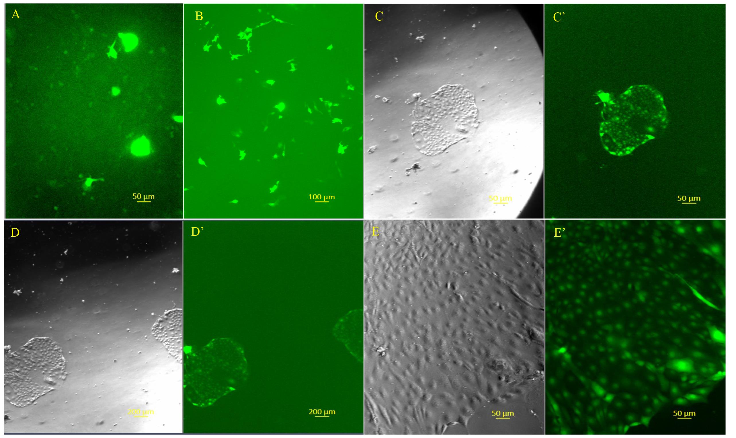 Figure 1. Representative images of different stages of CT29 cell labeling with GFP using CRISPR/Cas9 system. (A) Fluorescent image with GFP filter shows CT29 cells at 16 h post-transfection. (B) Fluorescent image with GFP filter shows CT29 cells at 48 h post-transfection. (C and C’) Images of the transfected CT29 cells following puromycin selection at 0.8 µg/mL for 12 days. The left and right panels show phase-contrast and GFP-labeled images, respectively. A few GFP-labeled cell clusters can sometimes be observed when a low magnification objective is used (D) phase-contrast; and (D’) GFP-labeled). (E and E’) Images of the phase-contrast (left panel), GFP-labeled (right panel) were taken when the puromycin resistant clonal cells in the original transfection plate are further cultured for 10 days in the same type of growth medium omitting the selection reagent following the 12-day selection period.