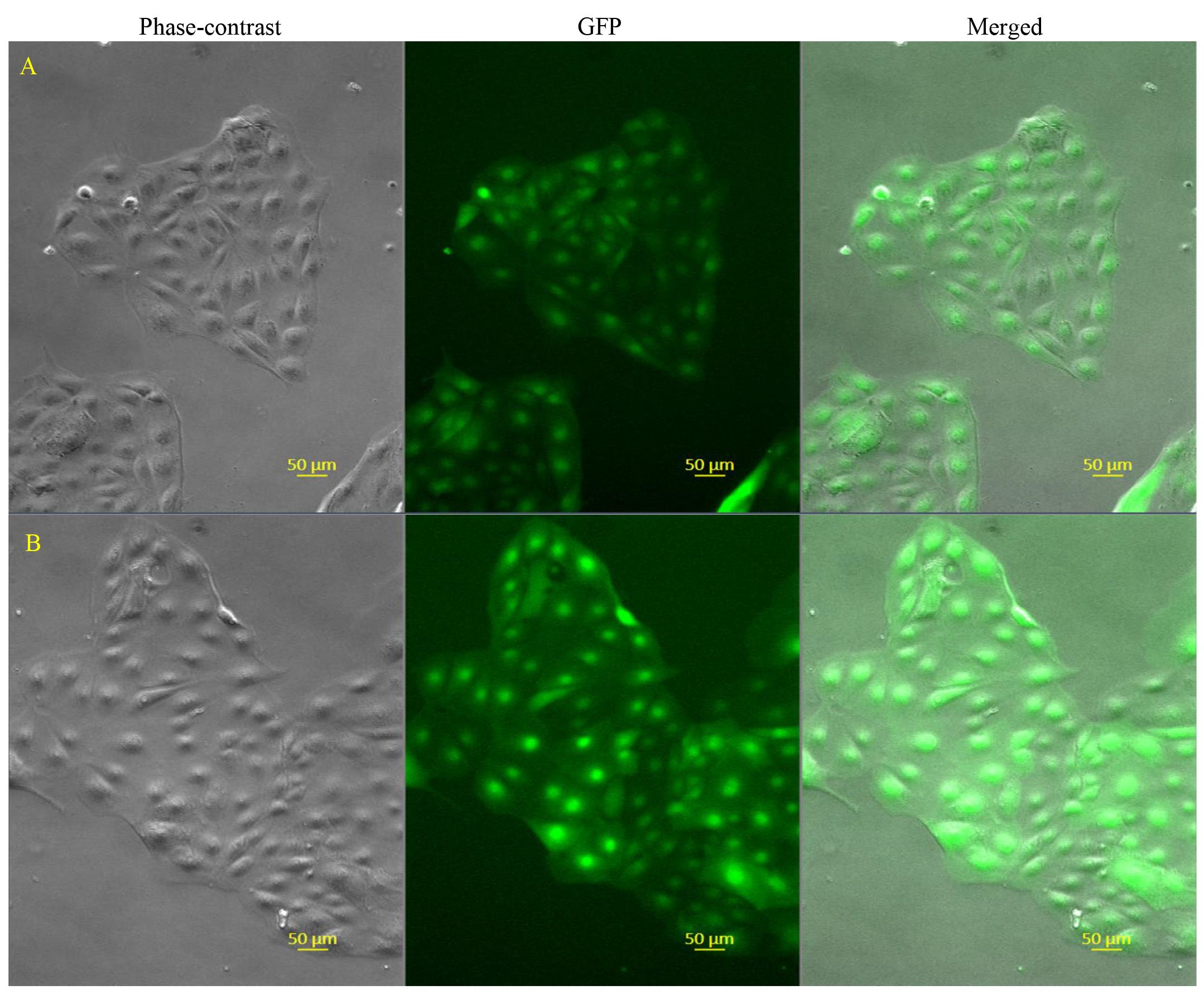 Figure 2. Representative images showing CT29-GFP cells maintained in TS growth medium. Frozen CT29-GFP cells were thawed and cultured in TS growth medium for 3 days and then passaged. Images from two distinct groups of cells (Cluster A and cluster B) were taken under a fluorescent microscope after passage and 3 days of culture to show more confirmative information. Phase-contrast imaging shows the morphology of live labeled CT29-GFP cells in culture. The green signal in the middle panel indicates the constitutive expressing of GFP by the labeled cells themselves. The third panel shows the merged signal.