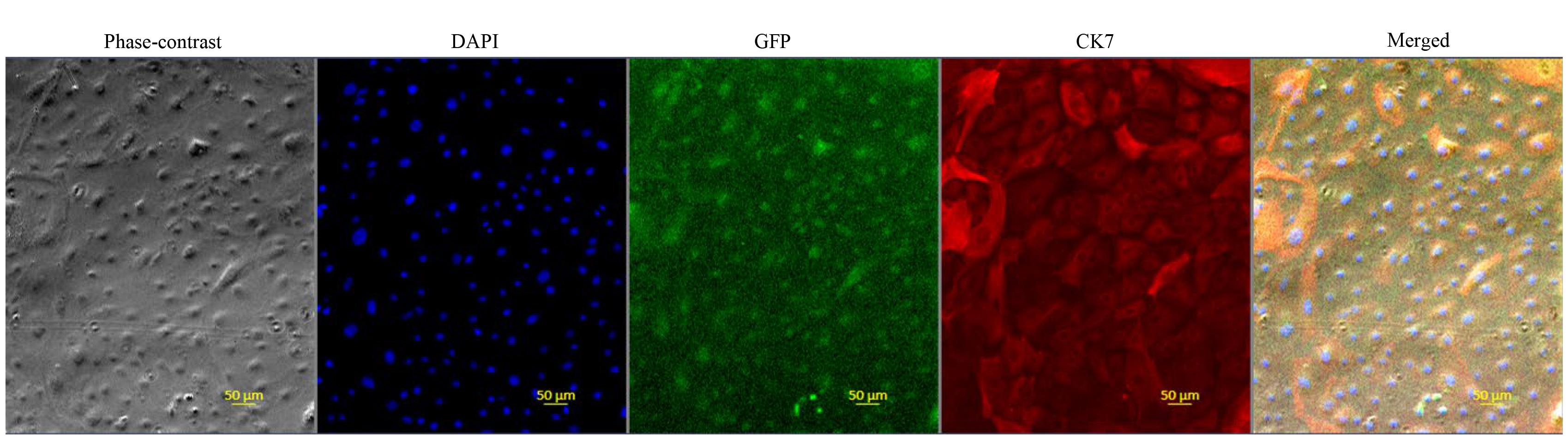 1. Perform routine immunofluorescence microscopy to check the expression profile of CK7 in the labeled CT29-GFP cells. CK7 is widely accepted as a reliable marker for identifying cells of the trophoblast lineage, and strong positive CK7 staining in our cells supported the trophoblast nature of the CT29-GFP cells after labeling (Figure 3).