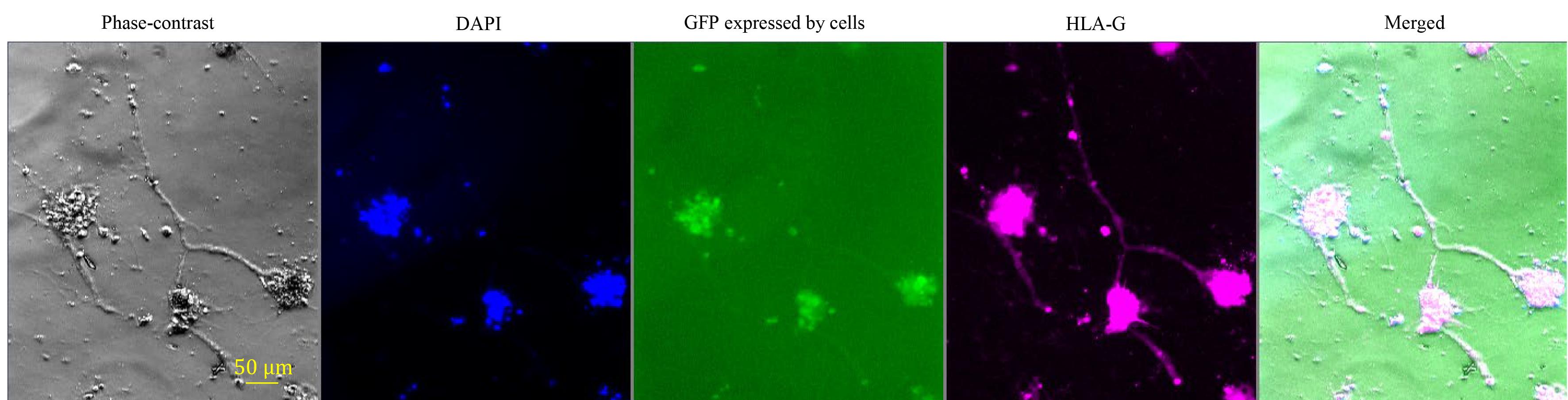 Figure 4. Immunofluorescence examination of the functional capacity of CT29-GFP cells to differentiate into EVT cells. Phase-contrast imaging visualizes spike-like morphological changes associated with the outgrowth of the live CT29-GFP cells differentiated toward the EVT lineage in culture. Nuclei were visualized with DAPI (blue). Green color demonstrates the constitutive expression of GFP by the labeled cells. HLA-G (an EVT marker) expression in the labeled cells was visualized in pink with an anti-HLA-G primary antibody. The fifth panel depicts merged DAPI and HLA-G antibody staining.