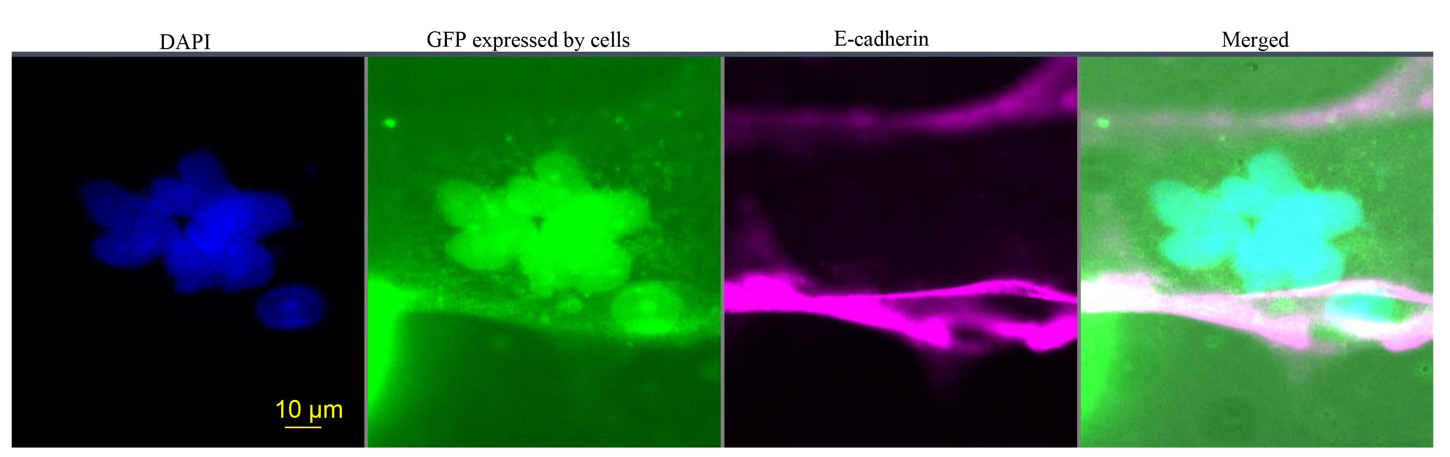 Figure 3. Morphological and molecular profiling of cultured CT29-GFP cells. Phase-contrast imaging shows the morphology of live labeled CT29-GFP cells in culture. Nuclei were stained with DAPI (blue). The green signal indicates the constitutive expression of GFP by the labeled cells themselves. Immunostaining for the CK7 trophoblast marker (red). The fifth panel shows merged DAPI and CK7 antibody staining.