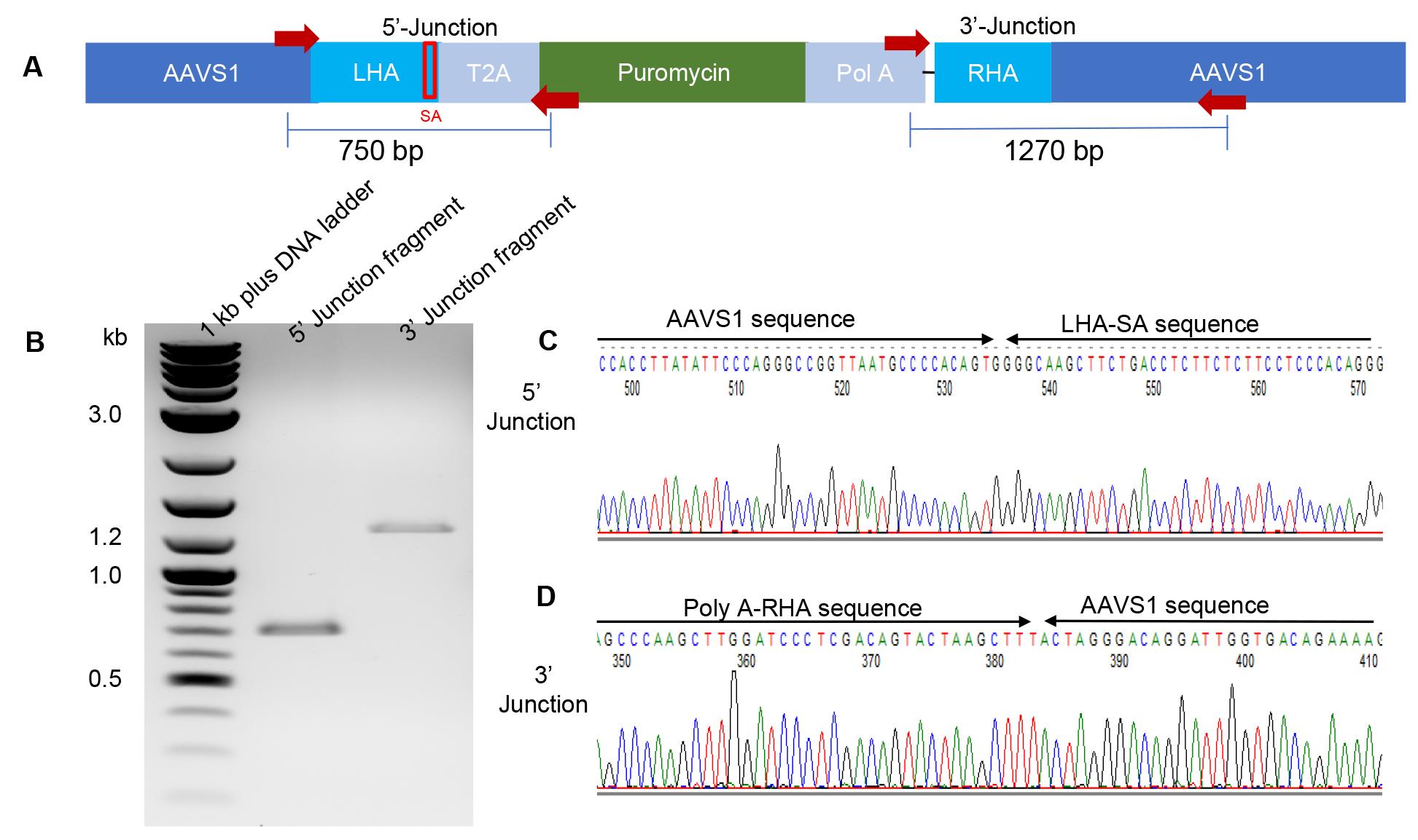 Figure 6. Reporter gene integration junction PCR analysis of CT29-GFP cells at the AAVS1 site. (A) The AAVS1 site after homology-directed repair-mediated genomic insertion of the donor cassette. The red arrows represent PCR primers and their respective product sizes. (B) PCR assessment of the mixed cell population with the specific primer pairs detected as single bands with the expected sizes deduced from the inserted sequence of the donor plasmid at the gRNA-targeted site. (C, D) Sequencing of the PCR products shows the 5′ junction between the AAVS1 site and the left homology arm (LHA) and the 3′ junction between the right homology arm (RHA) and the AAVS1 site, respectively.