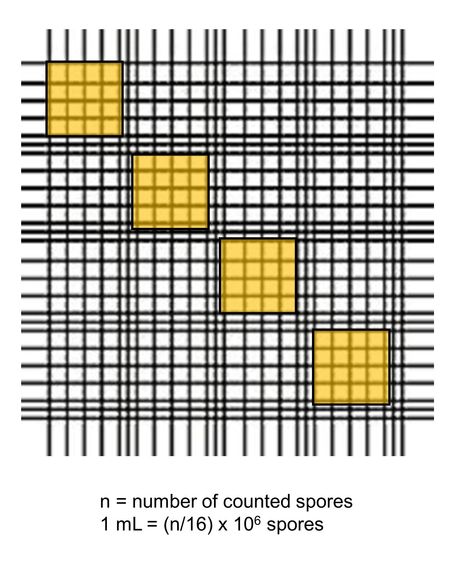 13. Dilute the conidia 1:100 and determine their concentration by using a Thoma counting chamber. Count the conidia of four diagonally arranged big squares. To calculate the amount of conidia for 1 mL, use this formula: n/16 × 106 spores (see Figure 2).