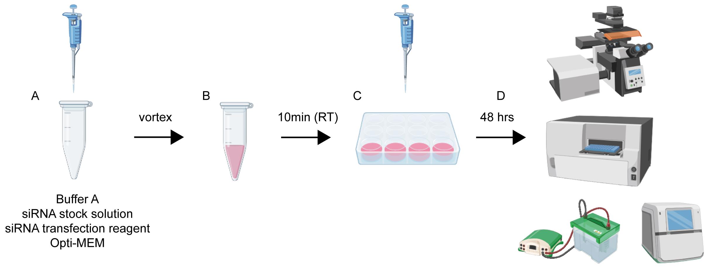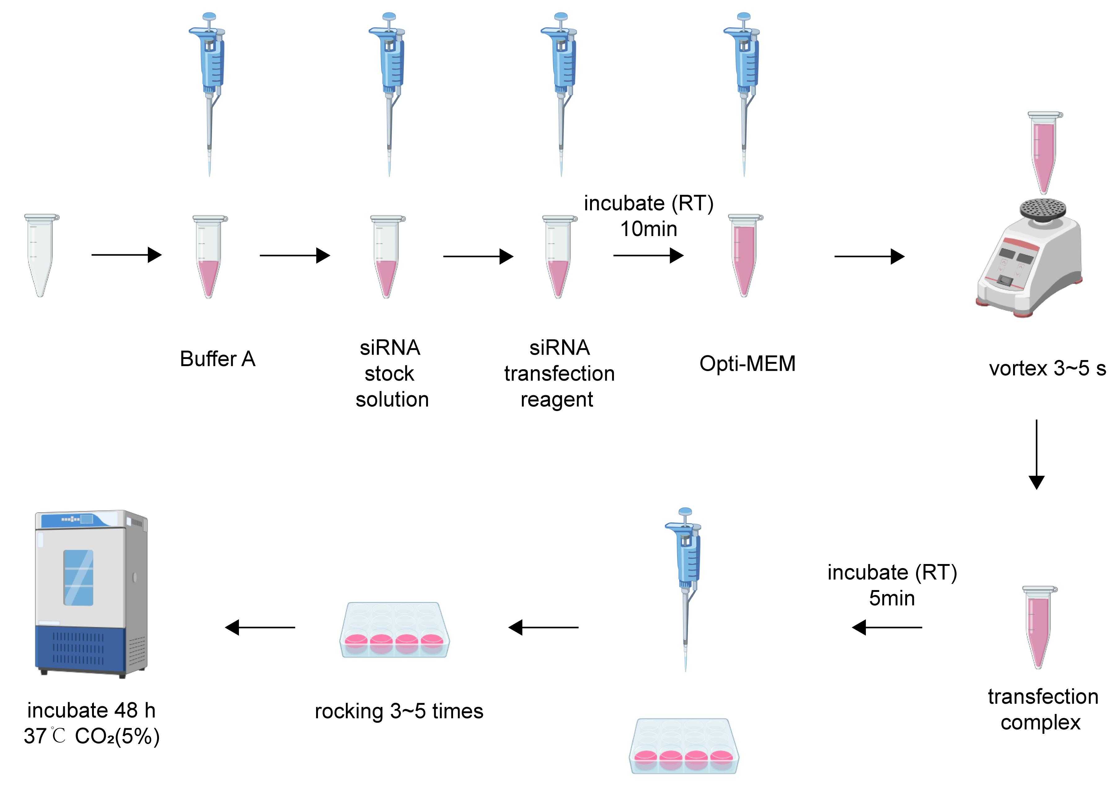 2. To prepare the siRNA-transfection complex for a single well of a 24-well plate, begin by adding 7 μL of buffer A into a sterile microcentrifuge tube. Next, add 0.5 μL of siRNA solution (from the 20 μM stock) and mix thoroughly by vortexing or pipetting. Then, add 2 μL of siRNA transfection reagent and mix completely. Incubate the mixture at room temperature for 10 min. Subsequently, add 45 μL of Opti-MEM medium and mix by pipetting up and down approximately five times to yield the final transfection complex, which is now ready for immediate use (Figure 1).