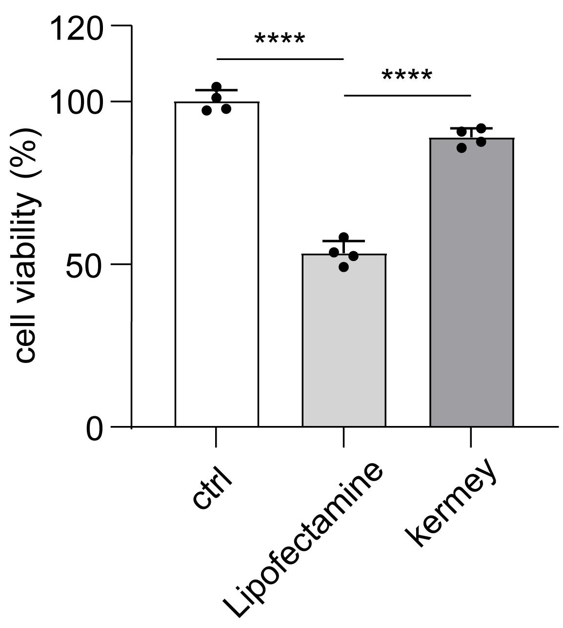3. One-way ANOVA analysis was used to analyze the difference between the control, lipofectamine, and Kermey groups.