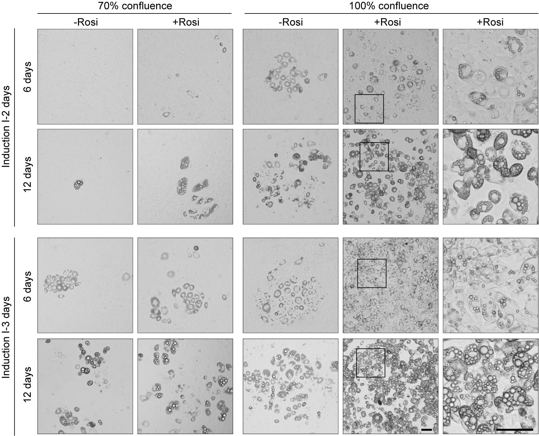Figure 2. High confluence, rosiglitazone, and extended induction combined to enhance adipogenic differentiation in 3T3-L1 preadipocytes. Representative images of 3T3-L1 preadipocytes following 6 and 12 days of differentiation under the indicated conditions of initial confluence (70% or 100%), with or without rosiglitazone, and induction I medium durations (2 or 3 days). Rosi, rosiglitazone. The furthest right panel shows a magnified view of the area boxed in the 100%+Rosi condition. Scale bar, 50 μm.