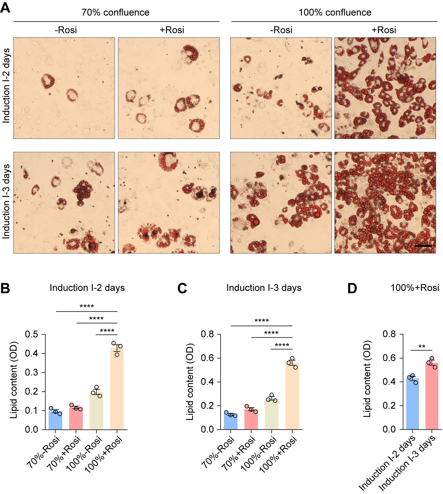 Figure 3. Representative Oil Red O staining and quantitative analysis of lipid content. (A) Representative Oil Red O staining images of 3T3-L1 preadipocytes following 12 days of differentiation under the indicated conditions of initial confluence (70% or 100%), with or without rosiglitazone, and induction I medium durations (2 or 3 days). Rosi, rosiglitazone. Scale bar, 50 μm. (B–D) Quantitative analysis of lipid content. OD, optical density. Values are presented as mean ± S.E.M. from three independent biological experiments. **P < 0.01, ****P < 0.0001. One-way ANOVA followed by Bonferroni post hoc test (B, C) and unpaired two-tailed Student’s t-test (D).