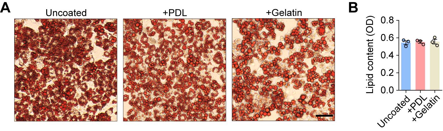 Figure 4. Adipogenic differentiation is similar on uncoated and poly-D-Lysine (PDL)- or gelatin-coated surfaces. (A) Representative Oil Red O staining images of 3T3-L1 preadipocytes following 12 days of differentiation on uncoated and PDL- or 0.1% gelatin-coated surfaces. Scale bar, 50 μm. (B) Quantitative analysis of lipid content. OD, optical density. Values are presented as mean ± S.E.M. from three independent biological experiments.