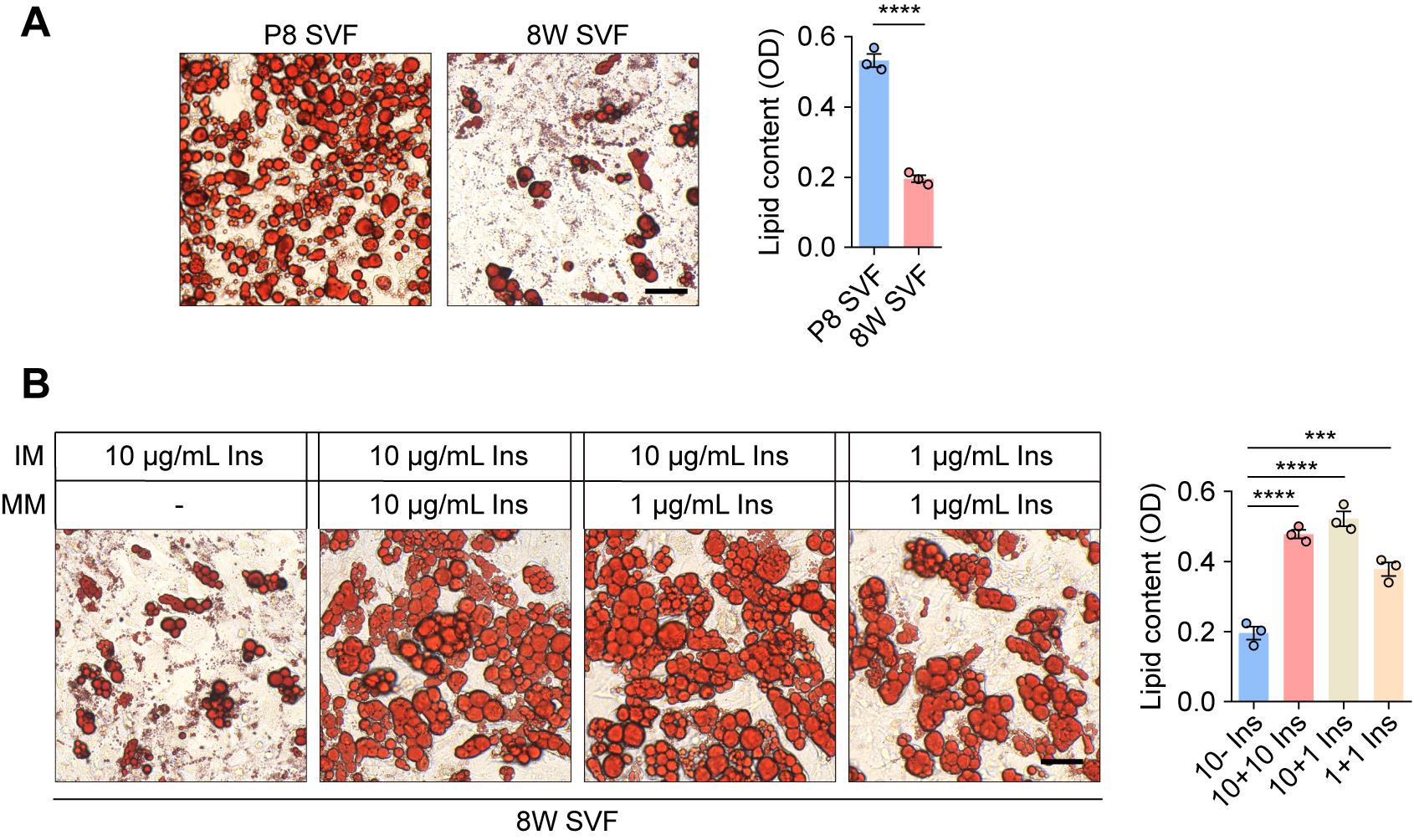 Figure 5. Optimization of insulin concentration for adult stromal vascular fraction (SVF). (A) Representative Oil Red O staining images of primary P8 and 8W SVF following 12 days of differentiation. Quantitative analysis of lipid content is shown on the right. Scale bar, 50 μm. (B) Representative Oil Red O staining images of primary 8W SVF following 12 days of differentiation under varying insulin concentrations in the induction and maintenance media. Quantitative analysis of lipid content is shown on the right. Scale bar, 50 μm. Ins, insulin; IM, induction medium; MM, maintenance medium. OD, optical density. Values are presented as mean ± S.E.M. from three independent biological experiments. ***P < 0.001, ****P < 0.0001. Unpaired two-tailed Student’s t-test (A) and one-way ANOVA followed by Bonferroni post hoc test (B).