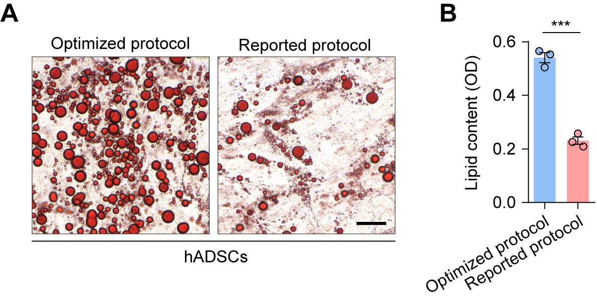 Figure 6. Comparison of adipogenic differentiation in human adipose-derived stem cells (hADSCs) using the optimized and a previously reported protocol. (A) Representative Oil Red O staining images of hADSCs following 12 days of adipogenic differentiation using the optimized protocol or the previously reported protocol (DEX, IBMX, insulin, and 200 μM indomethacin). Scale bar, 50 μm. (B) Quantitative analysis of lipid content. OD, optical density. Values are presented as mean ± S.E.M. from three independent biological experiments. ***P < 0.001. Unpaired two-tailed Student’s t-test.